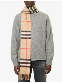 PRODUCT DETAILS - Burberry cashmere scarf - 100% cashmere - Self-tie fastening - Rectangular shape, all over check pattern, brushed, fringed edges, brand patch at back - Length: 168cm - Width: 30cm - Dry clean only - Made in Scotland - Lightweight, stretchy Ref: R03997970