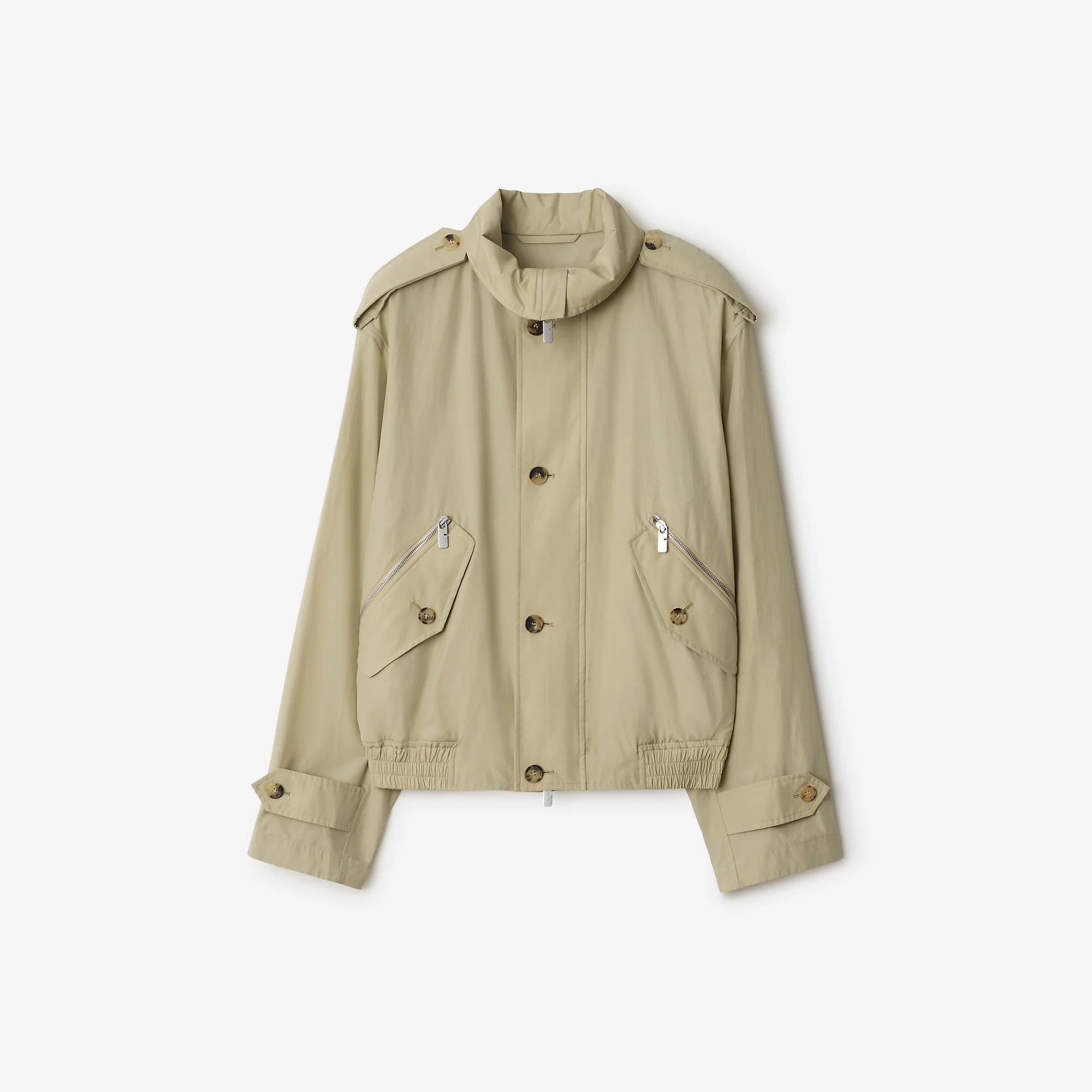 Product Details A jacket made in Italy from lightweight cotton nylon, tailored to a relaxed fit and partially lined in matching fabric. The funnel-neck style reworks elements from our heritage rainwear, mixing signature epaulettes and button-tab cuffs with B-cut zips. - Button and two-way zip closure - Epaulettes - Side zip and button-through flap pockets - Button-tab cuffs - Elasticated hem - Comes with a garment bag - Relaxed fit: a looser cut than our regular fit. - Machine wash - Item 81130391 Size & Fit - Length: 63.5cm/25in (size IT 48) - Model’s height: 188cm/6ft 2in. Model wears size IT 48 Fabric & Care - Outer: 65% cotton, 35% polyamide - Lining: 65% cotton, 35% polyamide - Buttons: buffalo horn - Made in Italy
