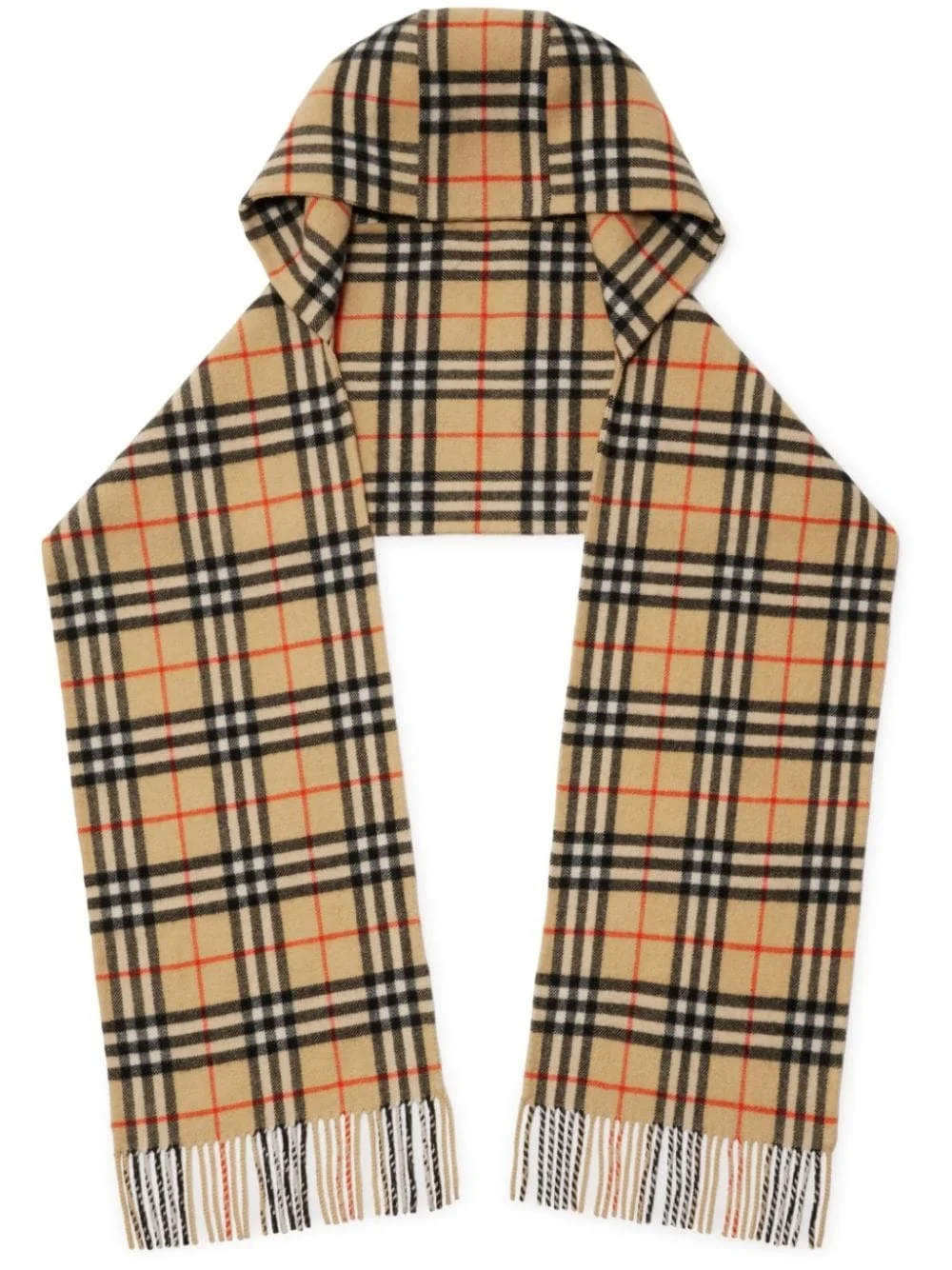 hooded cashmere scarf Highlights - Beige - Cashmere - Check pattern - Fringed edge - Classic hood - Rectangle shape Made in United Kingdom Composition Cashmere 100% SIZE & FIT Measurement LENGTH 82.67 in(210 cm) WIDTH 11.81 in(30 cm)