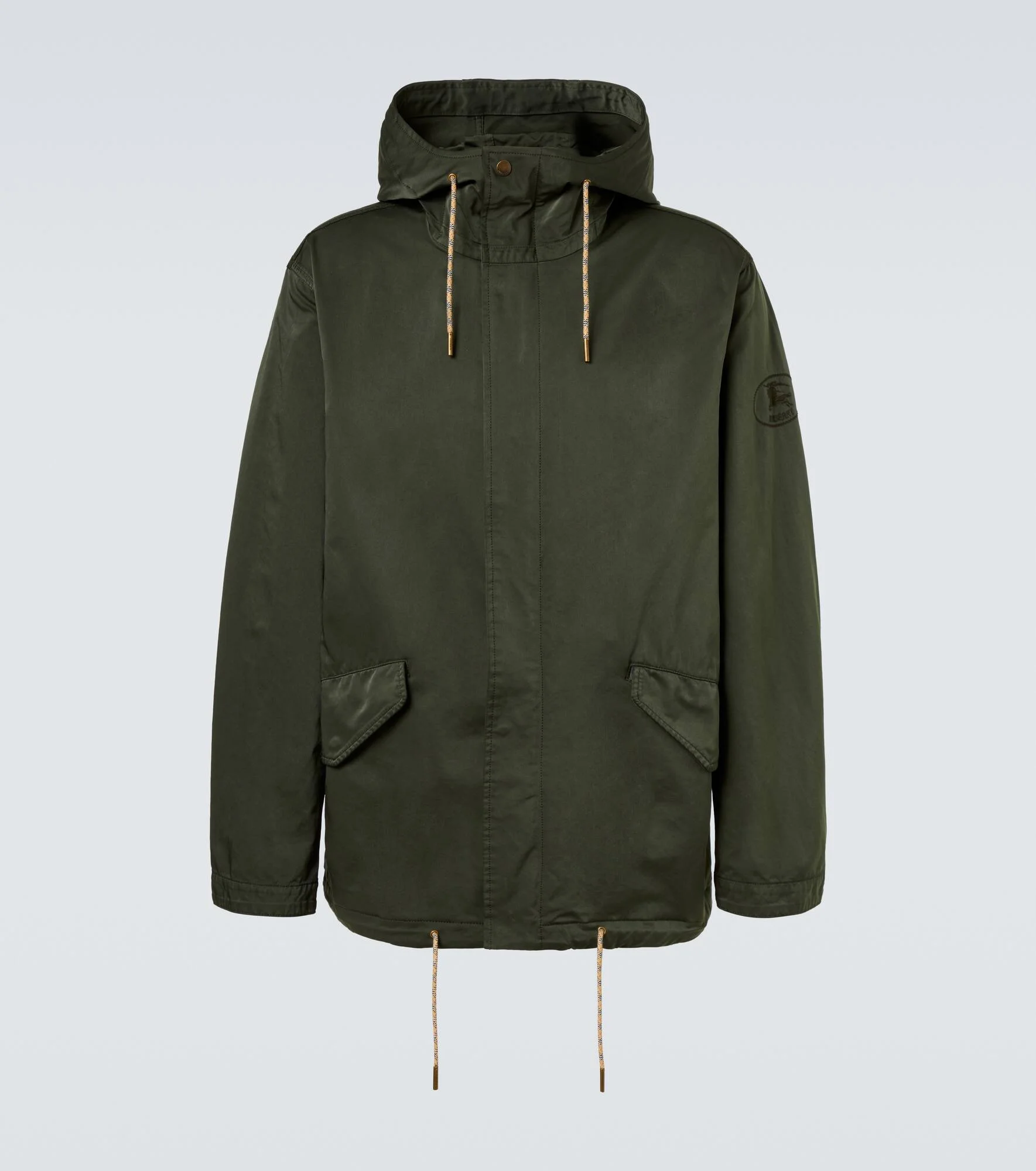 Founded in 1856, Burberry has built a reputation as a British heritage brand with unparalleled craftsmanship and groundbreaking innovation. This jacket is designed with a zipped front and a drawstring hood with the signature Burberry Check lining. Product Details - Material: 66% polyester, 34% polyamide - Care instructions: machine wash at 30 degrees - Made in China - Designer color name: Shale - Item color: green - Closure: two-way zipped front with snap-button fastenings - Pockets: flap pockets - Drawstring hood - Hem: drawstring at the hem for an adjustable fit - Item number: P01066726 Size & Fit - True to size - Dropped shoulders - Designed for a loose fit - Adjustable hem - Non-stretchy fabric - Falls below the hip - The model in the picture is 185cm-6'1" and wearing a size L
