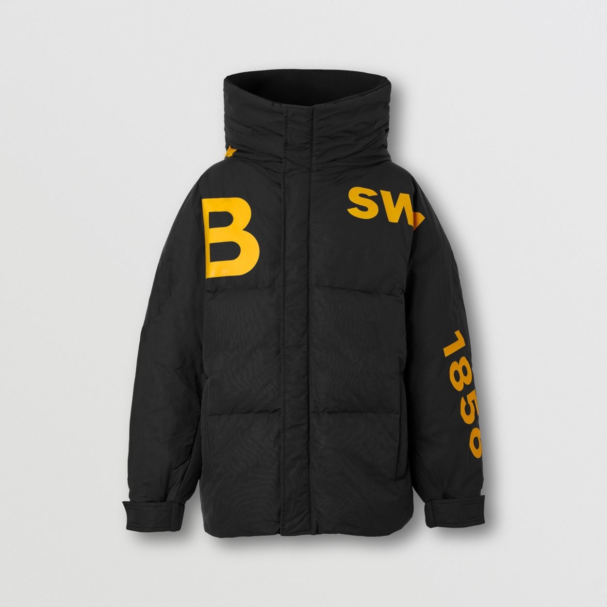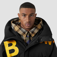 PRODUCT DETAILS A hooded puffer jacket in Italian-woven nylon, cut to an oversized fit. The style is highlighted with a seasonal Horseferry print and filled with goose down and feathers. Oversized fit. This style is cut to exaggerated proportions. Jacket length: 75cm/29.5in. This is based on a size UK M. Outer: 100% polyamide Hood: 100% polyester Trim: 98% polyamide, 2% elastane; 100% calf leather Lining: 100% cupro Filling: 90% goose down, 10% goose feathers Concealed press-stud and zip closure Welt pockets, interior press-stud pocket Drawcord hood Velcro-tab cuffs Wipe clean only Imported 80608761
