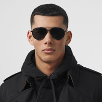 PRODUCT DETAILS Pilot sunglasses in black metal contoured with a tonal nylon rim. The style is accented with our enamelled Icon stripe at the temples. Frame width: 14.5cm/5.7in Frame height: 5.6cm/2.2in Metal and nylon fibre frame Scratch-resistant black lenses with 100% UV protection Printed Burberry lettering at temple tip Made in Italy Comes with a hard leather case and cleaning cloth 40816481