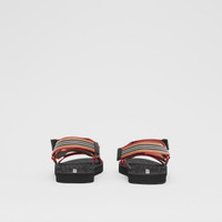 PRODUCT DETAILS Sandals secured with adjustable straps in our Icon stripe, finished with smooth leather trims and logo details. Upper: 60% polyamide, 30% polyester, 10% calf leather Lining: 50% elastolefin, 30% polyamide, 15% polyester, 5% calf leather Sole: 80% elastolefin, 20% rubber Velcro strap closure Printed Burberry lettering at strap Imported 80273991