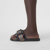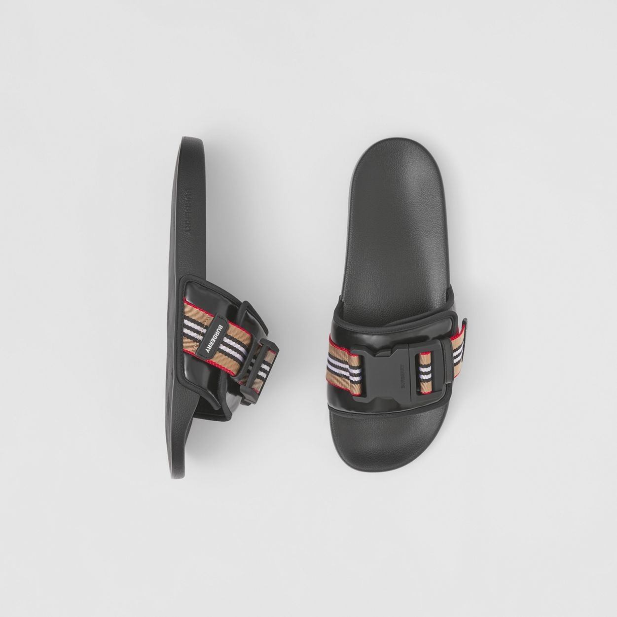 PRODUCT DETAILS Slides in high-shine coated canvas, featuring a contoured insole for comfort. The design is secured with an Icon stripe webbed strap and logo-tagged clip. Upper: 95% cotton, 5% calf leather Sole: 100% rubber Slip-on style with Velcro-tab and clip closure Printed Burberry lettering at strap, raised Burberry lettering at sole Imported 80389461