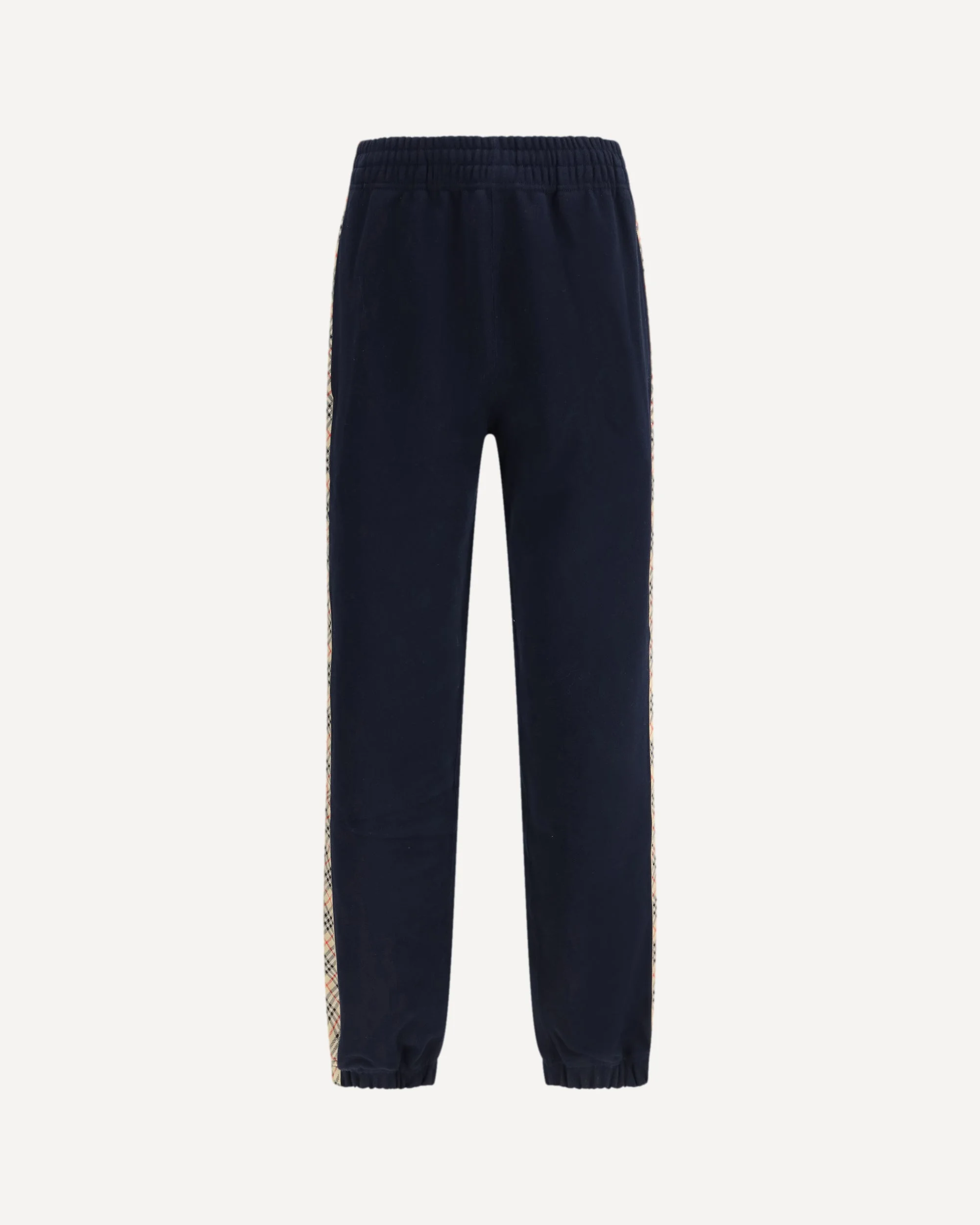 The jogging pants feature signature Burberry Check tape along the sides, combining comfort and style in a slim, modern silhouette. Designed with an elasticated drawcord waist, side slip pockets, and a back patch pocket, the piece is finished with the tonal embroidered Equestrian Knight Design, a distinctive emblem of the British house. DETAILS - Sku: 8118995_A1222 - Season: SS26 - Fit: Slim - Composition: GENERAL 100% Cotton - MADE IN PORTUGAL