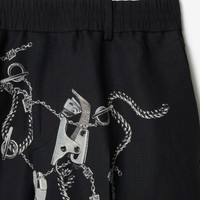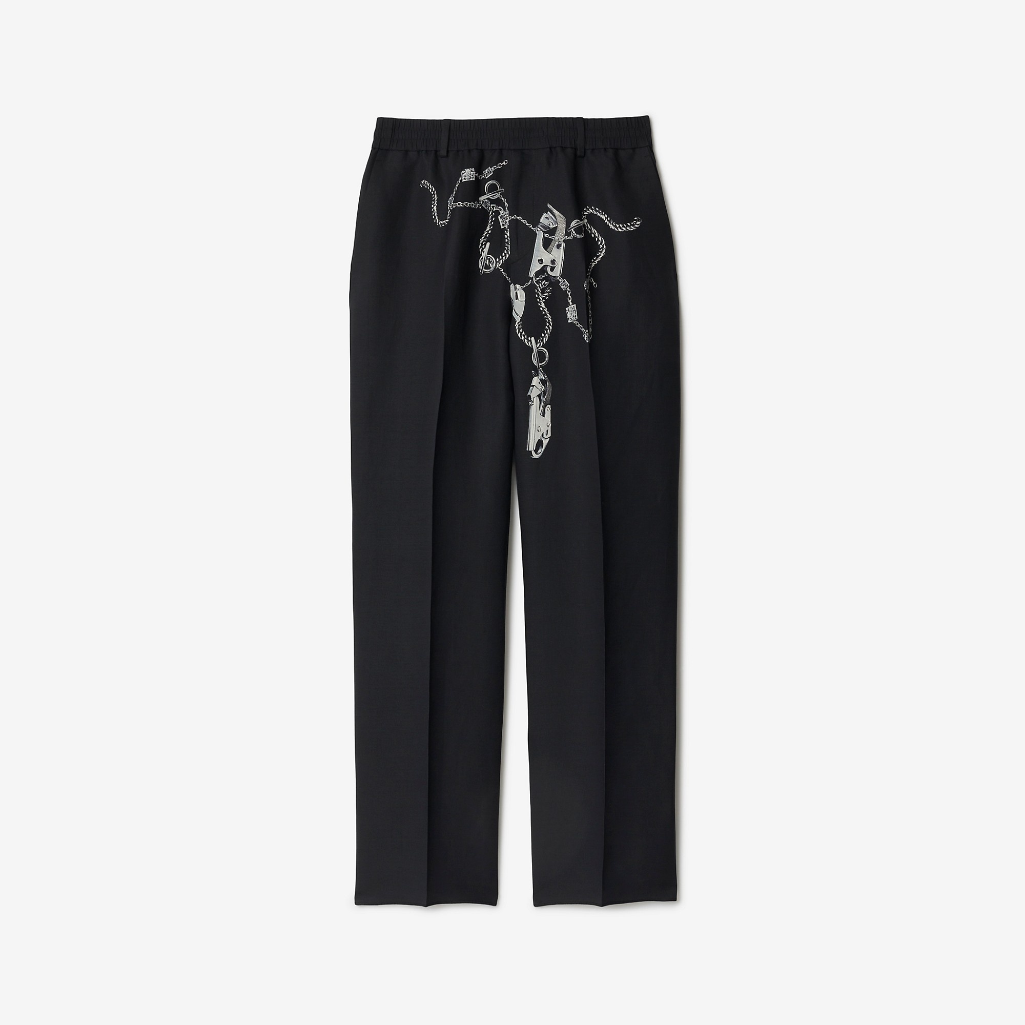PRODUCT DETAILS Italian-tailored trousers in canvas, woven with a lightweight paper and viscose yarn. The design is printed with hand-painted artwork featuring our jewellery and bag hardware. Cut to a relaxed fit with a concealed drawcord waist. - Inside leg length: 88.5cm/34.8in (size UK M) - Model’s height: 188cm/6ft 2in. Model wears size UK M Relaxed fit: a looser cut than our regular fit. Consider taking a size down. 69% paper fibre, 31% viscose Buttons: buffalo horn Specialist dry clean Made in Italy Item 80890591