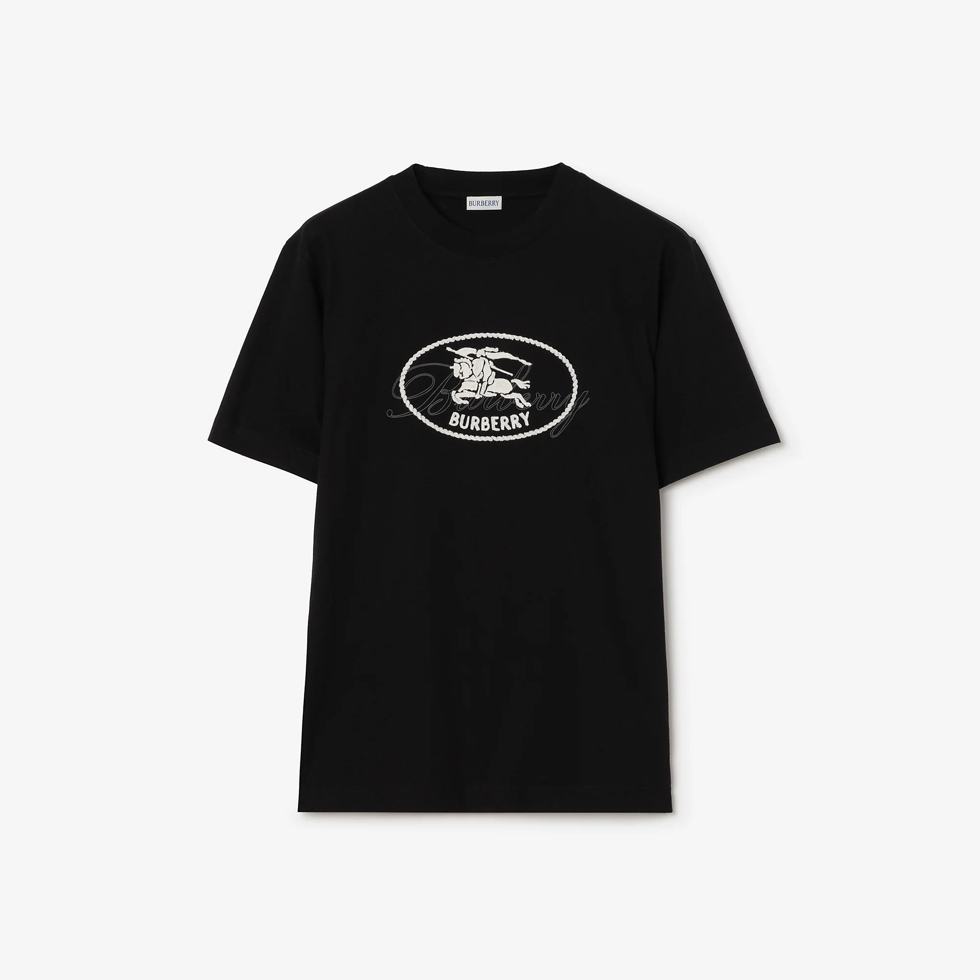 Product Details Regular fit. Fits true to size, take your normal size. A T-shirt made from cotton jersey, cut to a regular fit. The crew-neck style features a flocked logo print overlaid with our Knight stamp in chain-stitch embroidery – the archival motif was first seen on Burberry bags in the 1980s. - Rib-knit neckline - Printed Burberry lettering at chest - Machine wash - Item 81258231 Size & Fit - Regular fit. Fits true to size, take your normal size. - Length: 74cm/29.1in (size UK L) Fabric & Care - 100% cotton - Trim: 97% cotton, 3% elastane - Made in Portugal
