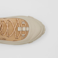 PRODUCT DETAILS Our runway sneaker crafted in a technical knitted stretch nylon. The style is capped with a matte overshoe inspired by rain boots and a cross-detailed tread referencing our iconic check. Upper: 80% polyamide, 12% elastane, 4% fibreglass, 3% cotton, 1% polyurethane Trim: 50% polyamide, 50% polyester Lining: 68% sheep leather, 30% polyester, 2% elastane Sole: 100% polyurethane Lace-up closure Embossed Burberry lettering at heel Made in Italy 80425811