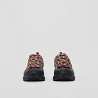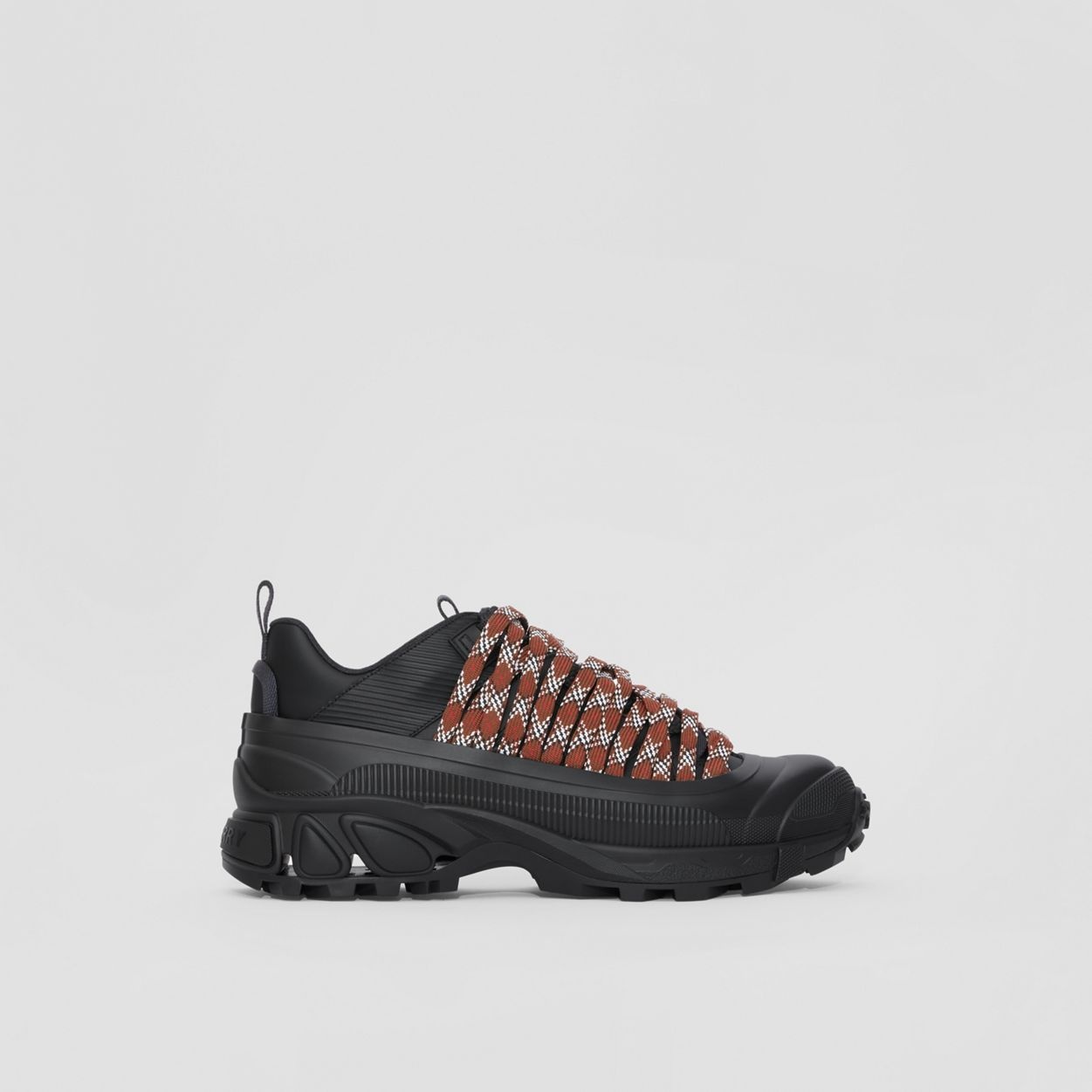 PRODUCT DETAILS Our runway sneaker crafted from leather and nylon, featuring criss-crossed laces patterned with our Exaggerated Check. The style is capped with a matte overshoe inspired by rain boots and a cross-detailed tread referencing our iconic check. The design made its debut in Riccardo Tisci's Autumn/Winter 2022 menswear collection. Upper: 85% calf leather, 15% polyamide Trim: 85% polyester, 10% polyamide, 5% thermoplastic polyurethane Lining: 60% polyester, 38% sheep leather, 2% polyurethane Sole: 100% polyurethane Lace-up closure Silicone patch with raised Burberry lettering at tongue, embossed Burberry lettering at heel Made in Italy 80589871