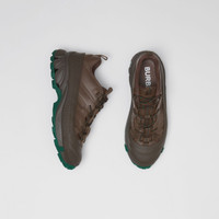 PRODUCT DETAILS Our runway sneaker crafted in leather. The style is capped with a matte overshoe inspired by rain boots and a contrasting cross-detailed tread referencing our iconic check. Upper: 100% calf leather Trim: 70% polyamide, 30% polyester Lining: 56% polyester, 35% sheep leather, 9% goat suede Sole: 100% polyurethane Lace-up closure Embossed Burberry lettering at heel Made in Italy 80457011