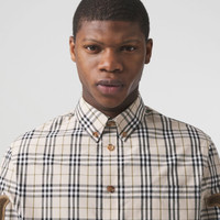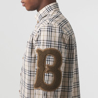 PRODUCT DETAILS A check cotton poplin shirt appliquéd with Thomas Burberry's initials in tactile towelling. Shirt length: 80cm/30.3in. This is based on a size UK M as proportions change slightly according to size. Model’s height: 191cm/6ft 3in. Model wears size UK M. 100% cotton Single-button cuffs Button-down collar Chest patch pocket Curved hem Machine wash Imported 80423501
