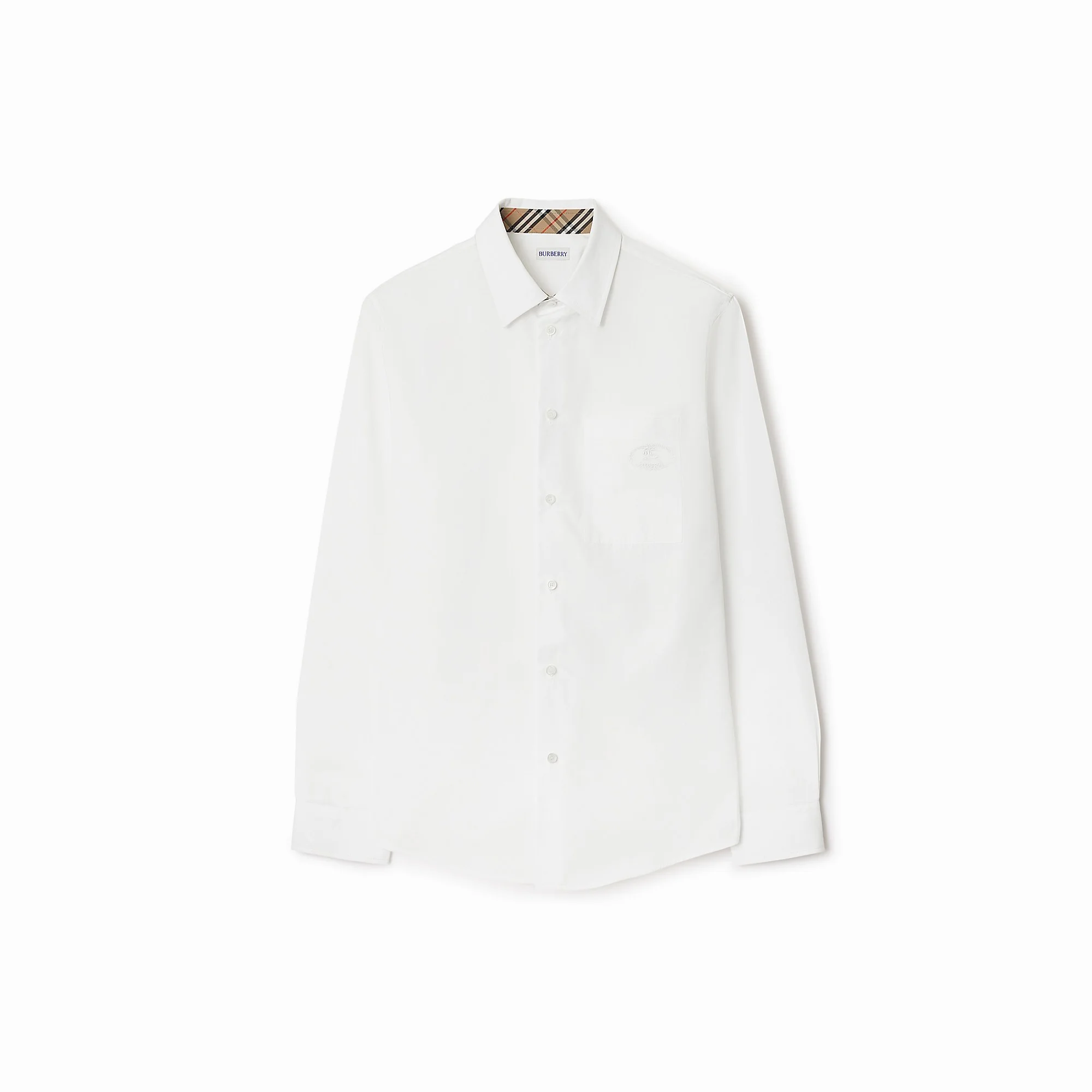 Product Details A shirt in Italian-woven cotton poplin, cut to a regular fit. The style is embroidered with a tonal Knight stamp, an archival motif first seen on Burberry bags in the 1980s. Roll back the cuffs to reveal the Burberry Check lining. - Button closure - Point collar - Chest patch pocket - Single-button cuffs - Curved hem - Embroidered Equestrian Knight Design at pocket - Regular fit. Fits true to size, take your normal size. - Machine wash - Item 81131351 Size & Fit - Length: 78cm/30.7in (size UK M) - Model’s height: 190cm/6ft 3in. Model wears size UK M Fabric & Care - 100% cotton - Buttons: mother-of-pearl - Imported