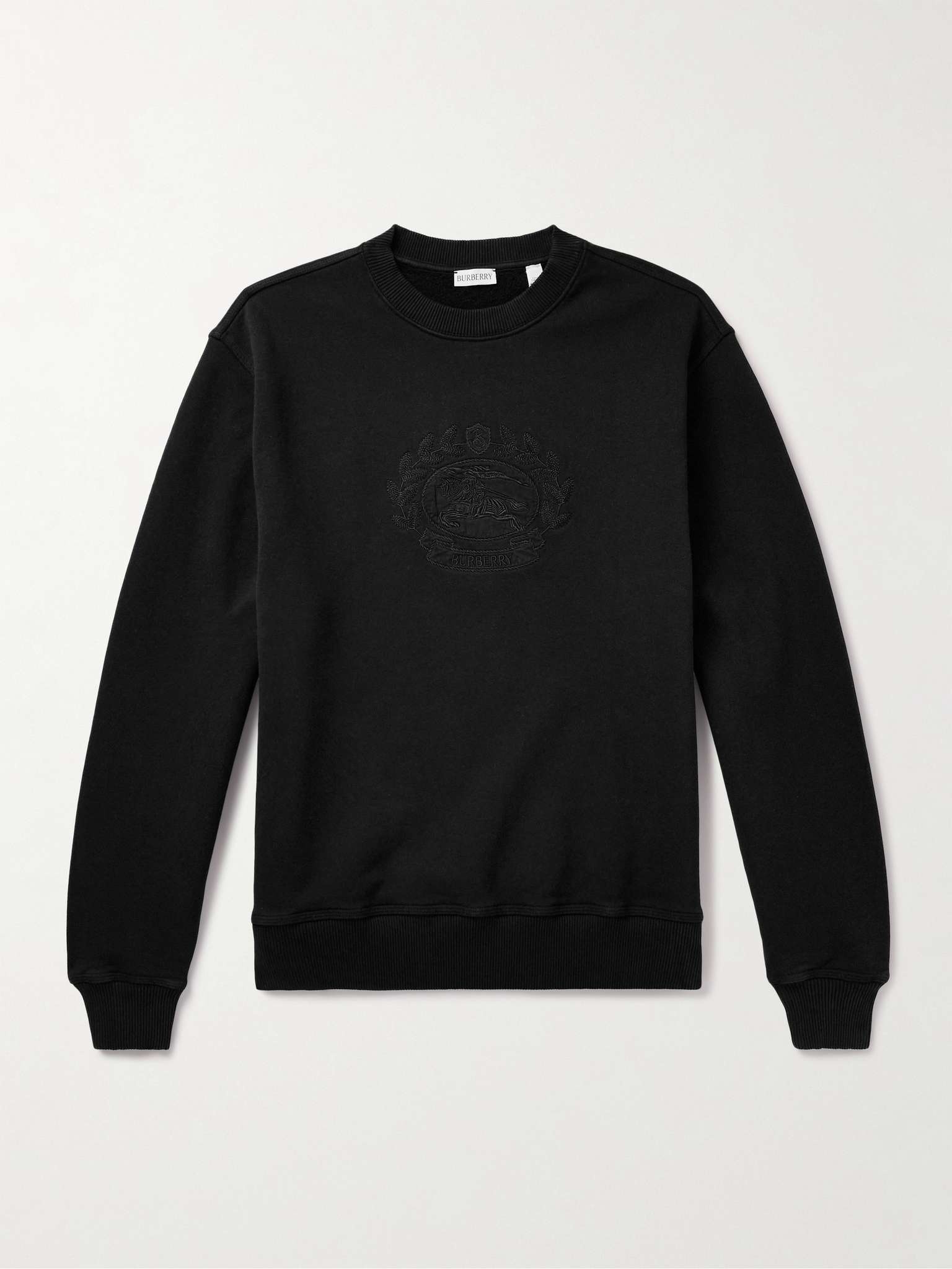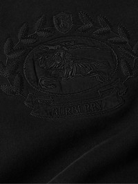 Burberry’s sweatshirt is embroidered with the brand’s signature jousting knight framed by a ring of leaves - the threads match the black cotton-jersey for a discreet finish. It's cut for a relaxed fit and backed by soft fleece. Size & Fit - Fits true to size. Take your normal size - Designed for a relaxed fit - Mid-weight, slightly stretchy fabric - Model is shown wearing a M - Model measures: chest 38"/ 96cm, height 6'1"/ 185cm Details & Care - Black fleece-back cotton-jersey - 100% cotton; trim: 99% cotton, 1% elastane - Machine wash