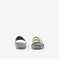 PRODUCT DETAILS Slides highlighted with our Exaggerated Check and logo, featuring a contoured insole for comfort. Upper: 100% thermoplastic polyurethane Sole: 100% rubber Slip-on style Raised Burberry lettering at front Imported Item 80629581
