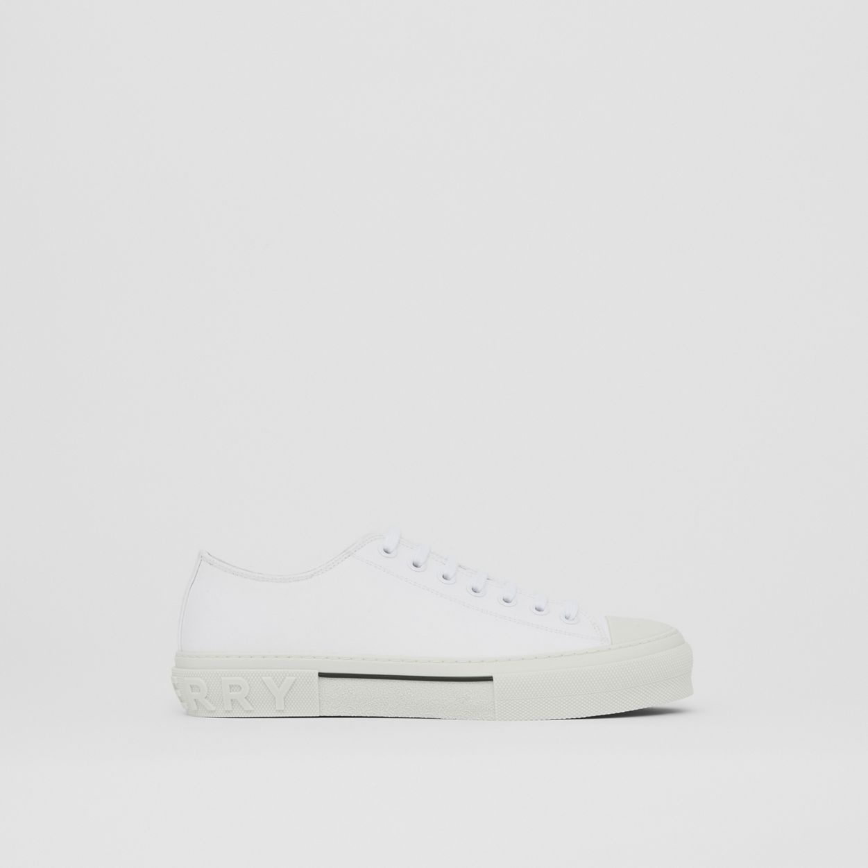 PRODUCT DETAILS Low-top sneakers containing organic cotton, highlighted with a tonal logo detail. Upper: 99% cotton, 1% calf leather Trim: 100% polyester Lining: 61% cotton, 32% sheep leather, 7% goat suede Sole: 100% rubber Lace-up closure Embossed Burberry lettering at heel Made in Italy 80523401