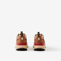 PRODUCT DETAILS A chunky sneaker panelled in Vintage Check and suede, highlighted with our logo and embroidered Thomas Burberry Monogram at the heel. The design is set on an accentuated, curved sole. Upper: 46% cotton, 22% calf suede, 18% leather, 14% calf leather Trim: 45% polyester, 30% polyurethane, 25% polyamide Lining: 38% sheep leather, 30% polyester, 25% polyamide, 8% goat suede Sole: 100% rubber Lace-up closure Printed Burberry lettering at side Made in Italy Item 80592561