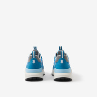 PRODUCT DETAILS A chunky sneaker panelled in leather, suede and a seasonal take on Burberry Check. Highlighted with our logo and embroidered Thomas Burberry Monogram, the design is set on an accentuated, curved sole. Upper: 34% polyester, 29% leather, 21% calf suede, 14% calf leather, 2% polyurethane Trim: 45% polyester, 30% polyurethane, 25% polyamide Lining: 85% polyester, 8% goat suede, 7% sheep leather Sole: 100% rubber Lace-up closure Printed Burberry lettering at side Made in Italy Item 80668351