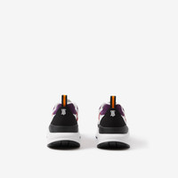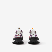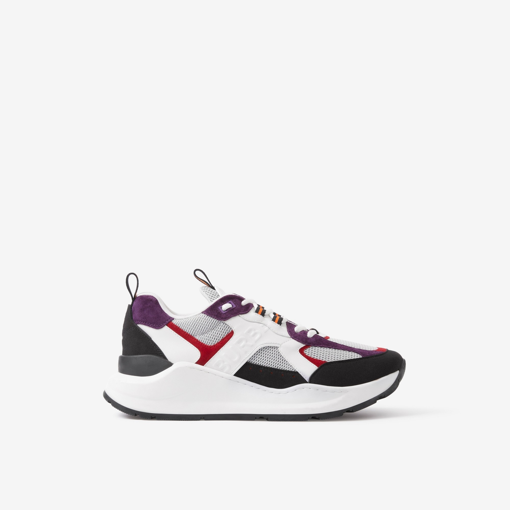 PRODUCT DETAILS A chunky sneaker panelled in leather, suede and mesh highlighted with a tonal logo and embroidered Thomas Burberry Monogram motif at the heel. The design is set on an accentuated, curved sole. Upper: 31% calf leather, 31% polyester, 18% calf suede, 11% polyurethane, 9% polyamide Trim: 45% polyester, 30% polyurethane, 25% polyamide Lining: 90% polyester, 8% sheep leather, 2% polyurethane Sole: 100% rubber Lace-up closure Printed Burberry lettering at side Made in Italy Item 80618731