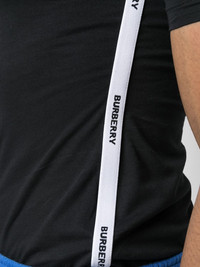 logo trim fitted T-shirt Who doesn't love a new T-shirt? This stretch-cotton design from Burberry is detailed with a tonal logo trim to each side. Yes please. Imported Composition Cotton 95%, Spandex/Elastane 5% SIZE & FIT Model measurements Height 6 ft 2 in(1.89 m) Bust/Chest 35.43 in(90 cm) Hips 36.61 in(93 cm) Waist 28.74 in(73 cm) Washing instructions Machine Wash
