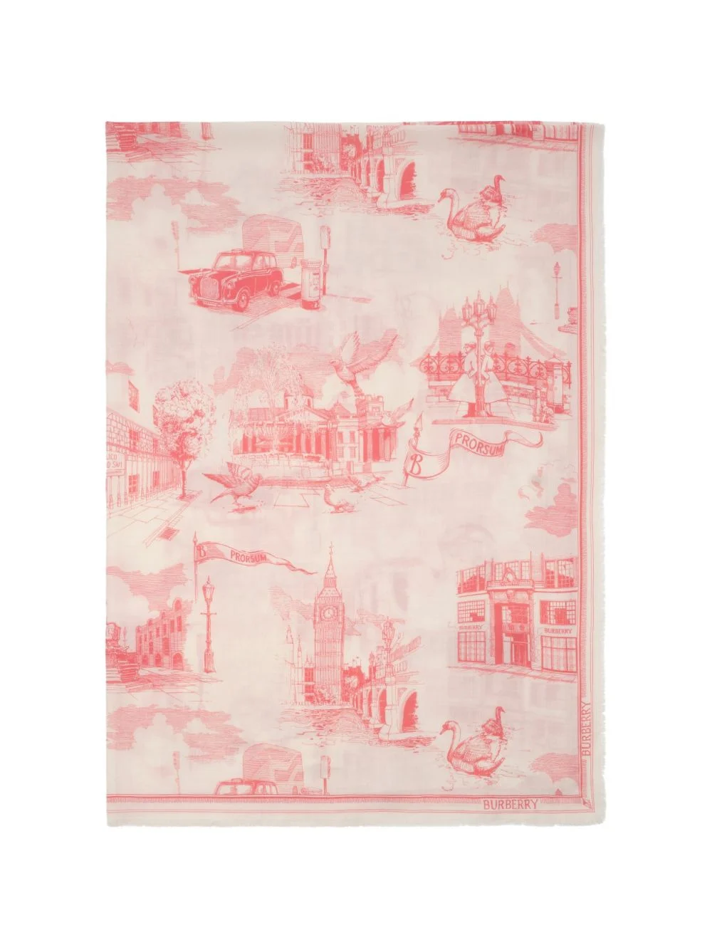 London Landmarks wool silk scarf Highlights - A lightweight scarf made in italy from wool silk. the design is printed with hand-drawn artwork depicting iconic london landmarks including the houses of parliament, tower bridge, trafalgar square and our horseferry house headquarters. - Rectangular - Eyelash fringing at edges - Printed burberry lettering at border Made in Italy Composition Wool 50%, Silk 50% SIZE & FIT Measurement LENGTH 76.77 in(195 cm) WIDTH 53.14 in(135 cm)