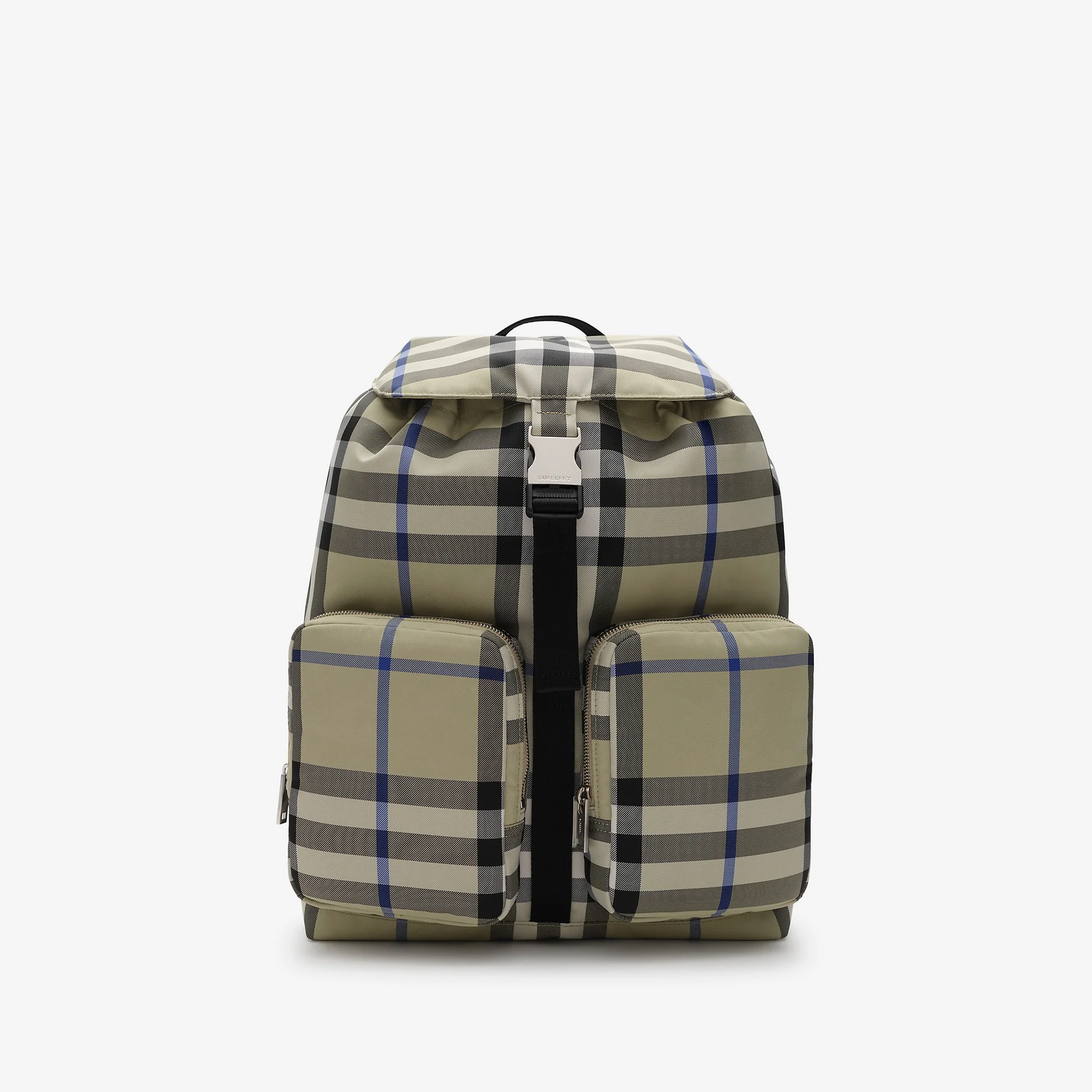 Product Details A backpack woven with the Burberry Check in seasonal lichen beige and lined in a solid colour. The design features a logo-engraved clip closure and zip pockets to store smaller items. - Top handle - Adjustable shoulder straps - Clip and drawcord closure - Two exterior zip pockets - Brushed metal hardware - Nylon lining - Item 81195791 Size & Fit - 33 x 17 x 39cm/13 x 6.7 x 15.4in Fabric & Care - Outer: 92% polyester, 8% polyurethane - Trim: 100% leather - Lining: 100% polyamide - Imported