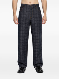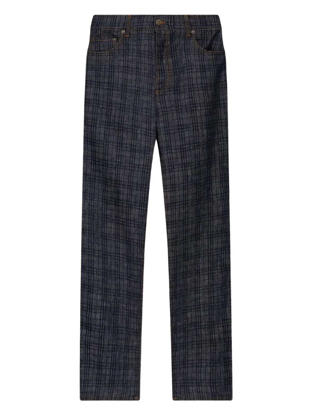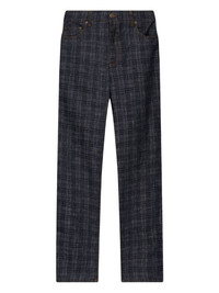 checked jeans Highlights - Blue - Logo patch to the rear - Check pattern - Front button fastening - Classic five pockets Made in Italy Composition Cotton 100%, Lamb Suede 50%, Calf Leather 50% Washing instructions Machine Wash