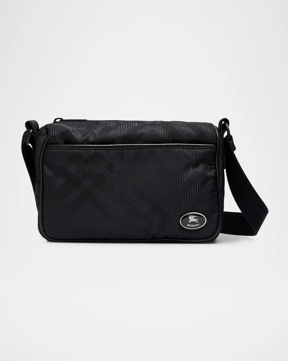 - Burberry compact crossbody bag woven in the tonal Burberry Check for a discreet, yet distinctive finish - Enamelled Knight stamp, an archival motif first seen on Burberry bags in the 1980s - Adjustable webbing strap - Zip closure - Exterior, one front slip pocket - Nylon lining - Approx. 6.7"H x 10.2"W x 2.4"D - Nylon/polyurethane - Made in Italy
