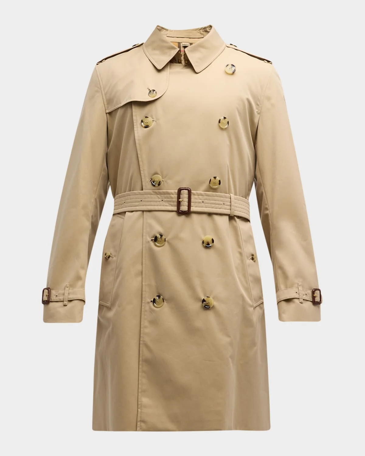 - Burberry "Kensington" trench coat made from water-resistant gabardine - Hook-and-eye collar closure - Throat latch - Shoulder epaulettes - Belted waist and cuffs - Side button welt pockets - Center back vent - Burberry Check lining and undercollar - Buckles: calf leather - Cotton - Lining: Cotton/viscose - Made in United Kingdom - Model is 6'1"/185cm.