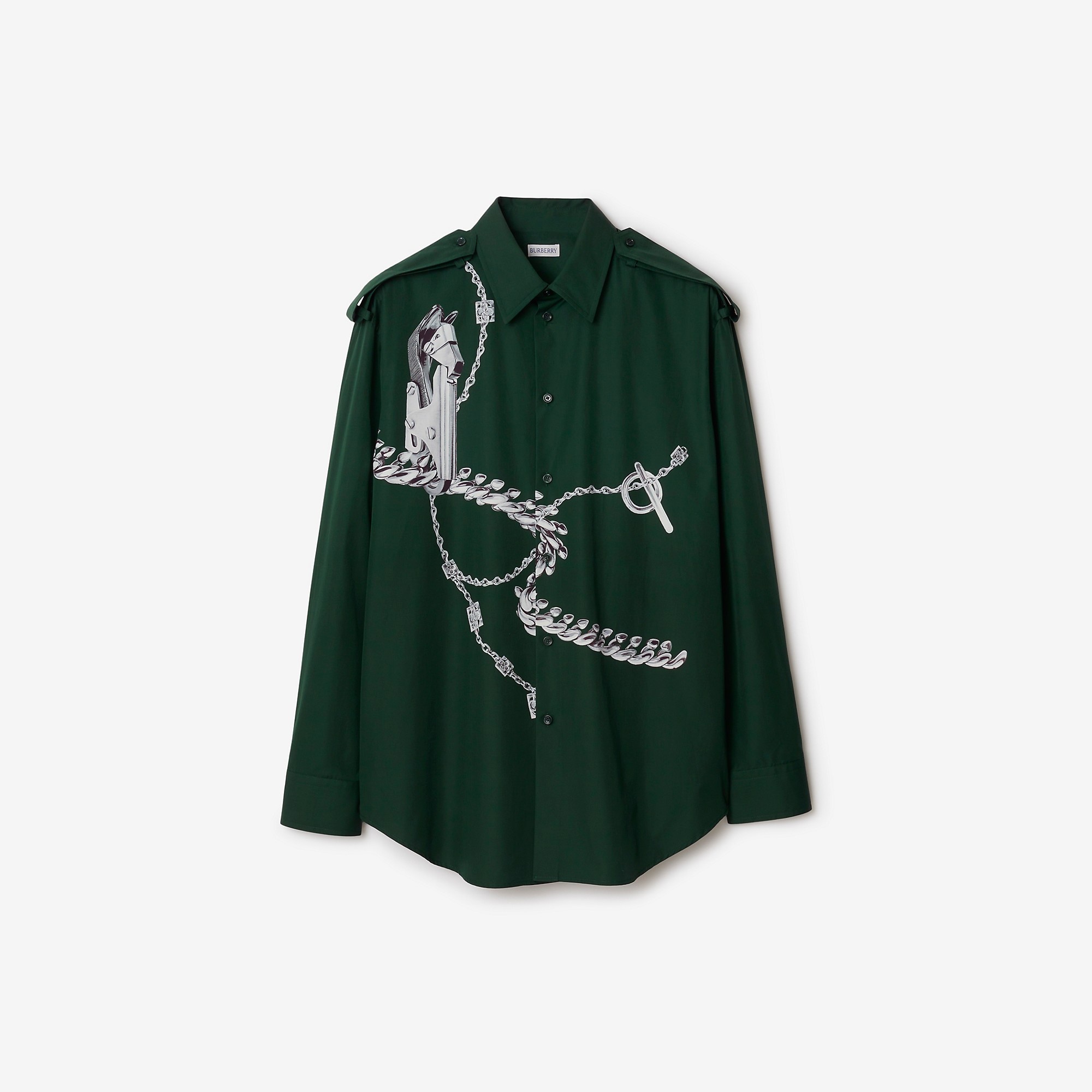 Product Details A long-sleeved shirt tailored from cotton poplin. The design is cut to an oversized fit and printed with hand-painted artwork featuring our jewellery and bag hardware. - Button closure - Point collar - Epaulettes - Single-button cuffs - Curved hem - Oversized fit: our loosest cut, designed for exaggerated proportions. We recommend sizing down. - Item 80890711 Size & Fit - Length: 83.5cm/32.9in (size UK L) - Model’s height: 188cm/6ft 2in. Model wears size UK L Fabric & Care - 100% cotton - Buttons: mother-of-pearl - Specialist dry clean - Imported