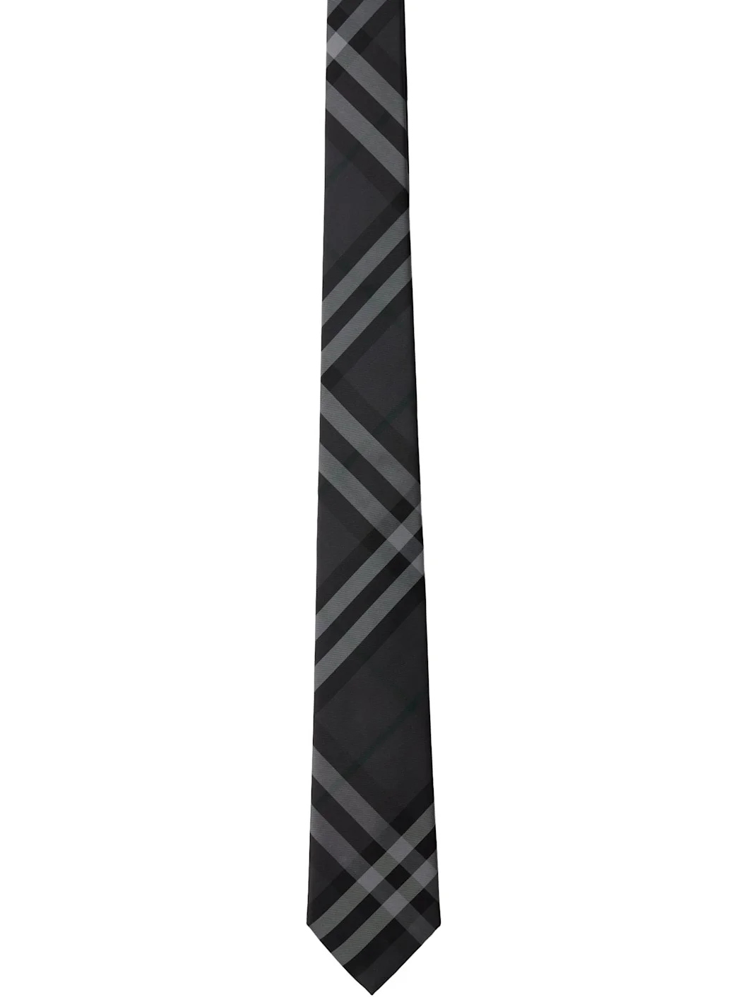 Silk twill tie in gray. · Signature check pattern throughout · Logo patch and keeper loops at back face · W2.75" Supplier color: Charcoal 100% silk. Made in Italy 252376M158000
