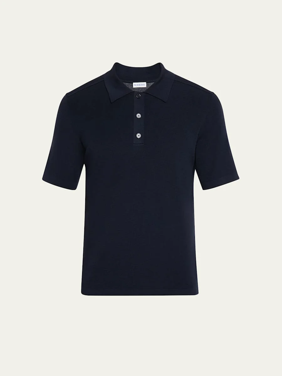 Burberry solid wool knit polo shirt defined by signature Check trim on the placket Spread collar Three-button placket Short sleeves Pullover style Wool/nylon Made in Italy Online Inquiries: BGS21_NDL33| Store Inquiries: #5043518