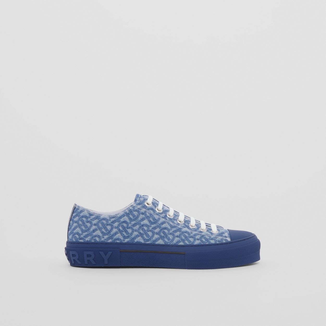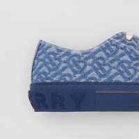 PRODUCT DETAILS Low-top sneakers reimagined in denim, highlighted with the Thomas Burberry Monogram and our logo. Upper: 97% cotton, 3% calf leather Trim: 70% polyester, 30% brass Lining: 66% cotton, 28% sheep leather, 6% goat suede Sole: 100% rubber Lace-up closure Embossed Burberry lettering at heel Made in Italy 80559781