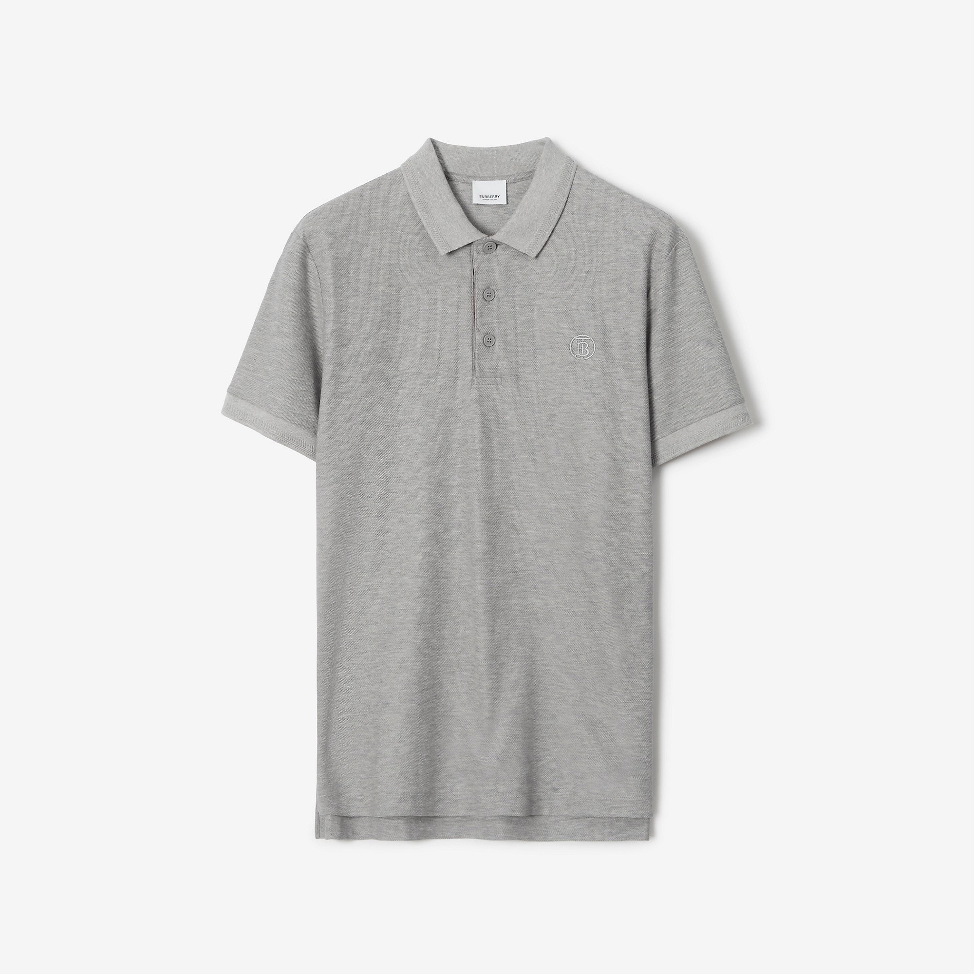 Product Details A polo shirt in cotton pique embroidered with the initials of our founder, Thomas Burberry. The design is cut to a slim fit and lined with Burberry Check at the placket. - Button placket - Embroidered Thomas Burberry Monogram at chest - Slim fit: this style is cut to a fitted silhouette. Fits true to size, take your normal size. - Machine wash - *Containing organic cotton - Item 80529661 Size & Fit - Length: 75cm/29.5in (size UK L) - Model’s height: 186cm/6ft 1in. Model wears size UK L Fabric & Care - 100% cotton* - Trim: 100% cotton - Imported