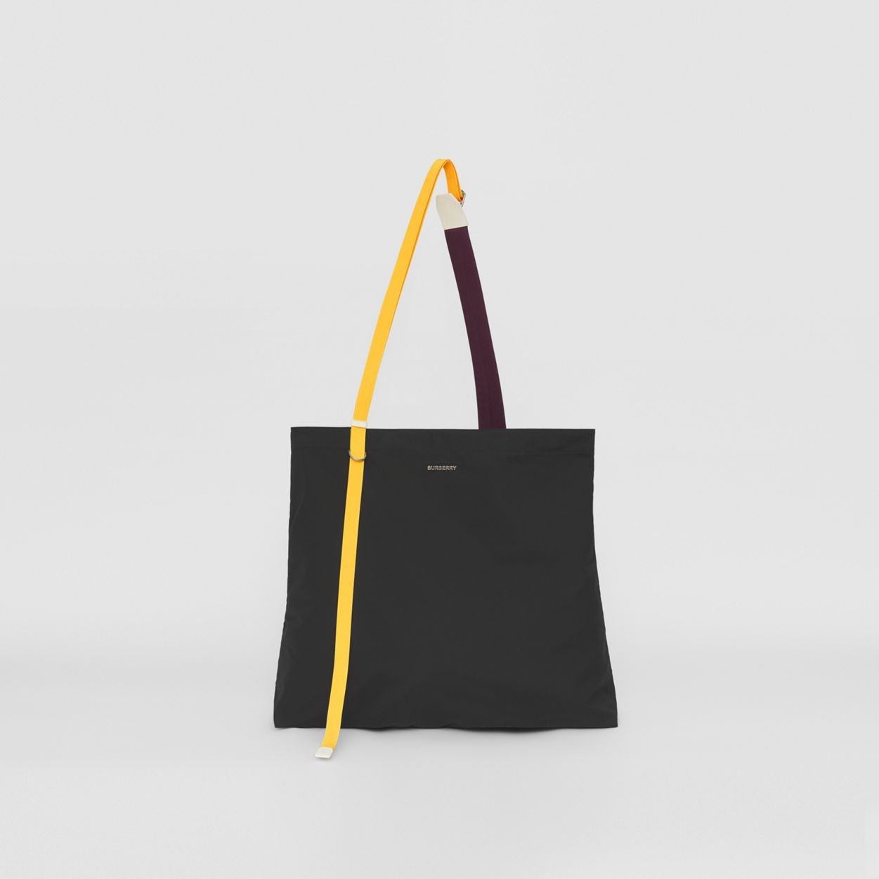 PRODUCT DETAILS A runway tote bag in nylon, highlighted with an asymmetric, reconstructed strap – a union of sartorial and hiking influences. The design made its debut in Riccardo Tisci’s Autumn/Winter 2021 menswear collection, which is inspired by British craft and outdoor movements of the early 20th century. 48 x 13 x 55cm/18.9 x 5.1 x 21.7in Min. shoulder strap drop: 45cm/17.7in Max. shoulder strap drop: 65cm/25.6in Outer: 100% polyamide Trim: 100% calf leather Lining: 100% polyamide Adjustable shoulder strap One interior zip pocket Open top Hand-painted edges Polished metal hardware Raised Burberry lettering at front Made in Italy 80468951