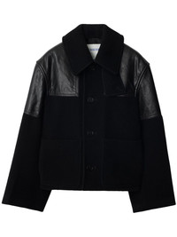 panelled leather-wool jacket Highlights - Black - Wool/leather - Panelled design - Front button fastening - Throat latch - Side patch pockets - Button waist tabs Made in Italy Composition Calf Leather 100%, Wool 100% Washing instructions Specialist Cleaning