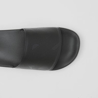 PRODUCT DETAILS Leather slides perforated with the Thomas Burberry Monogram. The design features topstitch detailing and a contoured insole for comfort. Upper: 100% calf leather Lining: 75% rubber, 25% sheep leather Sole: 100% rubber Raised Burberry lettering at side Made in Italy 80453011