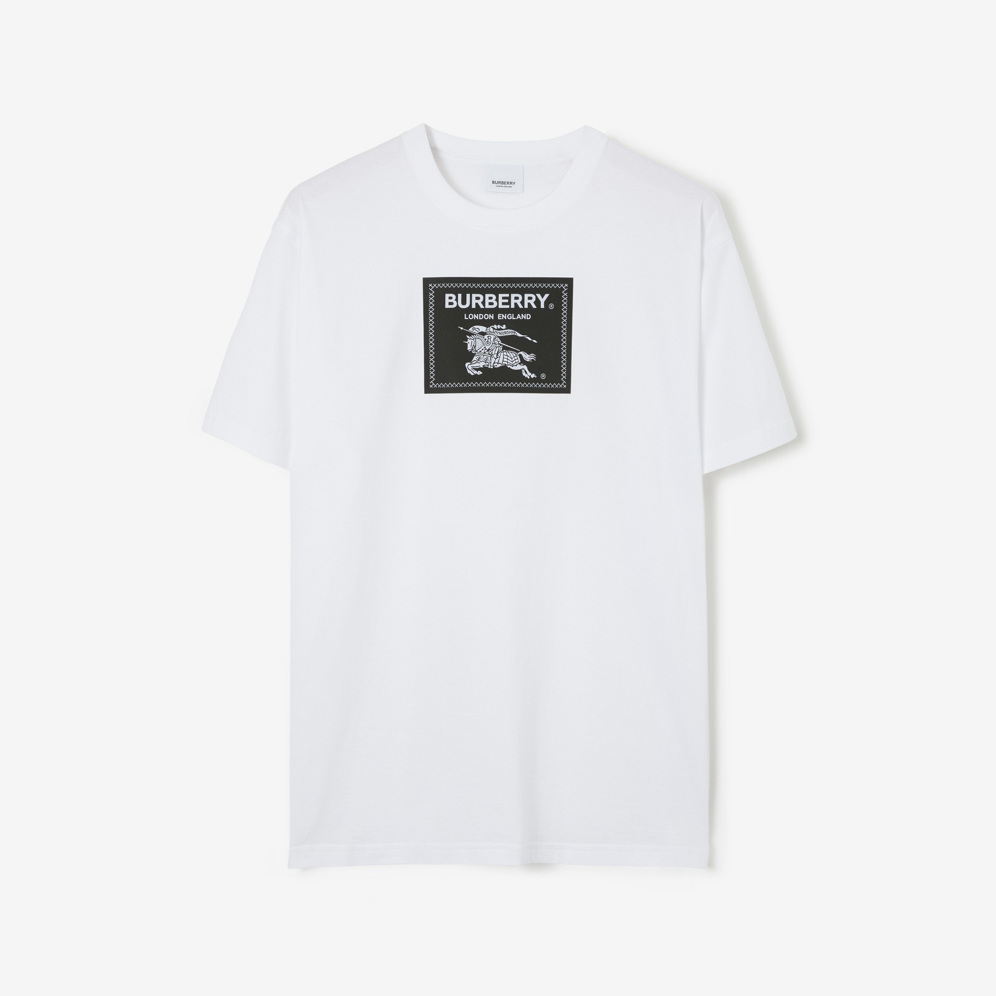 PRODUCT DETAILS A T-shirt containing organic cotton, cut to a relaxed fit. The design features an appliquéd patch highlighted with our logo and the Equestrian Knight Design – inspired by labels found in archive Burberry pieces. The rider’s banner reads ‘Prorsum’, a Latin term which translates to ‘forwards’. - T-shirt length: 74cm/29.1in. This is based on a size UK M. - Model’s height: 188cm/6ft 2in. Model wears size UK M. Relaxed fit. This style is cut to a loose silhouette. 100% cotton Trim: 96% cotton, 4% elastane Machine wash Imported Item 80643971