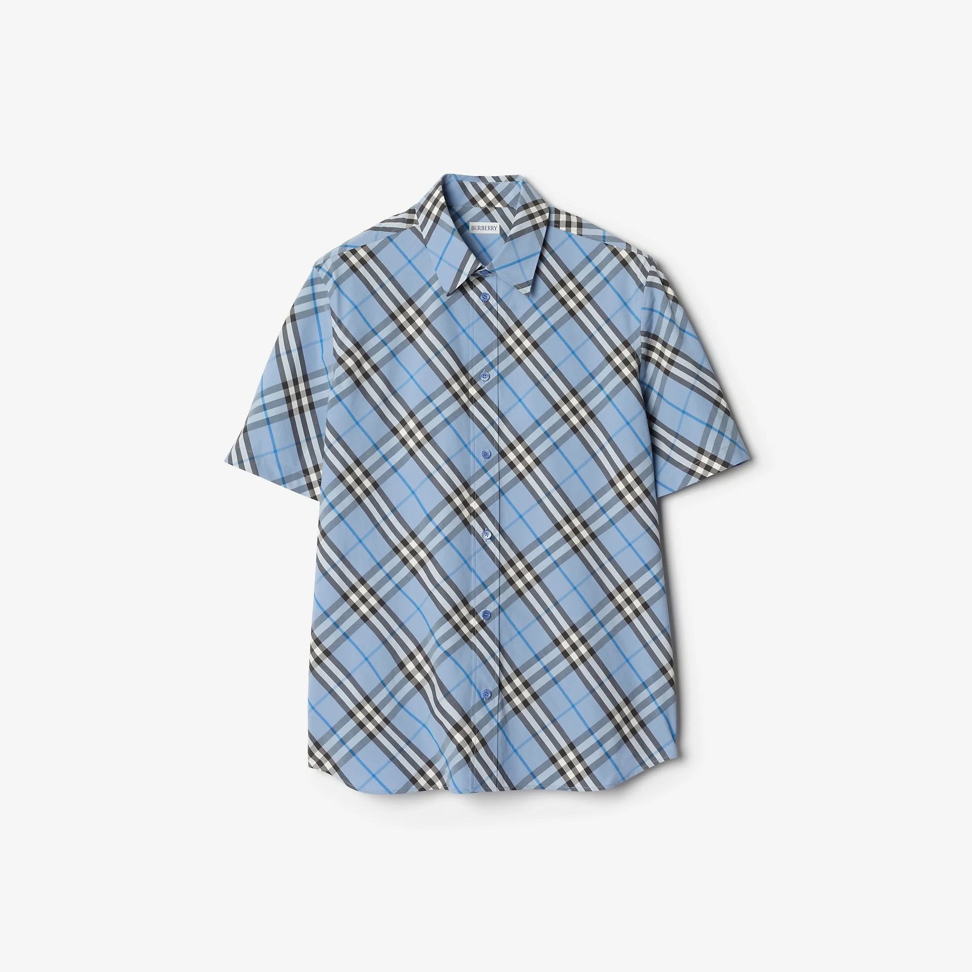 Product Details Regular fit. Fits true to size, take your normal size. A short-sleeved cotton poplin shirt woven with the Burberry Check in a seasonal cornflower blue. The style is tailored to a regular fit with a single back pleat. - Button closure - Point collar - Curved hem - Item 81236741 Size & Fit - Regular fit. Fits true to size, take your normal size. - Length: 78.5cm/30.9in (size UK L) Fabric & Care - 100% cotton - Buttons: mother-of-pearl - Specialist dry clean - Imported
