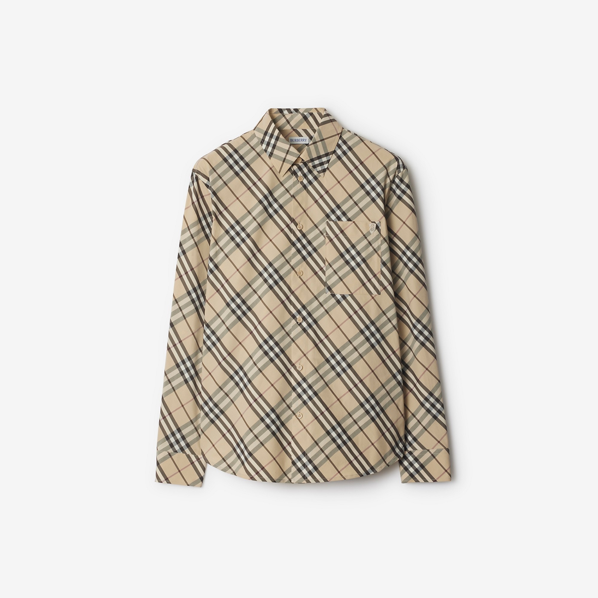 Product Details A long-sleeved shirt in cotton twill, woven in Italy with the Burberry Check. The design is tailored to a relaxed fit and embroidered with our B shield, a motif inspired by the Equestrian Knight Design. - Button closure - Point collar - Chest patch pocket - Single-button cuffs - Embroidered B shield at pocket - Curved hem - Relaxed fit: a looser cut than our regular fit. - Machine wash - Item 81052021 Size & Fit - Length: 76cm/29.9in (size UK M) - Model’s height: 185cm/6ft 1in. Model wears size UK M Fabric & Care - 100% cotton - Buttons: mother-of-pearl - Imported