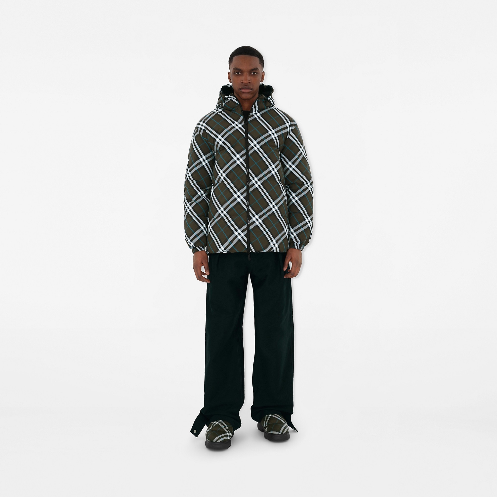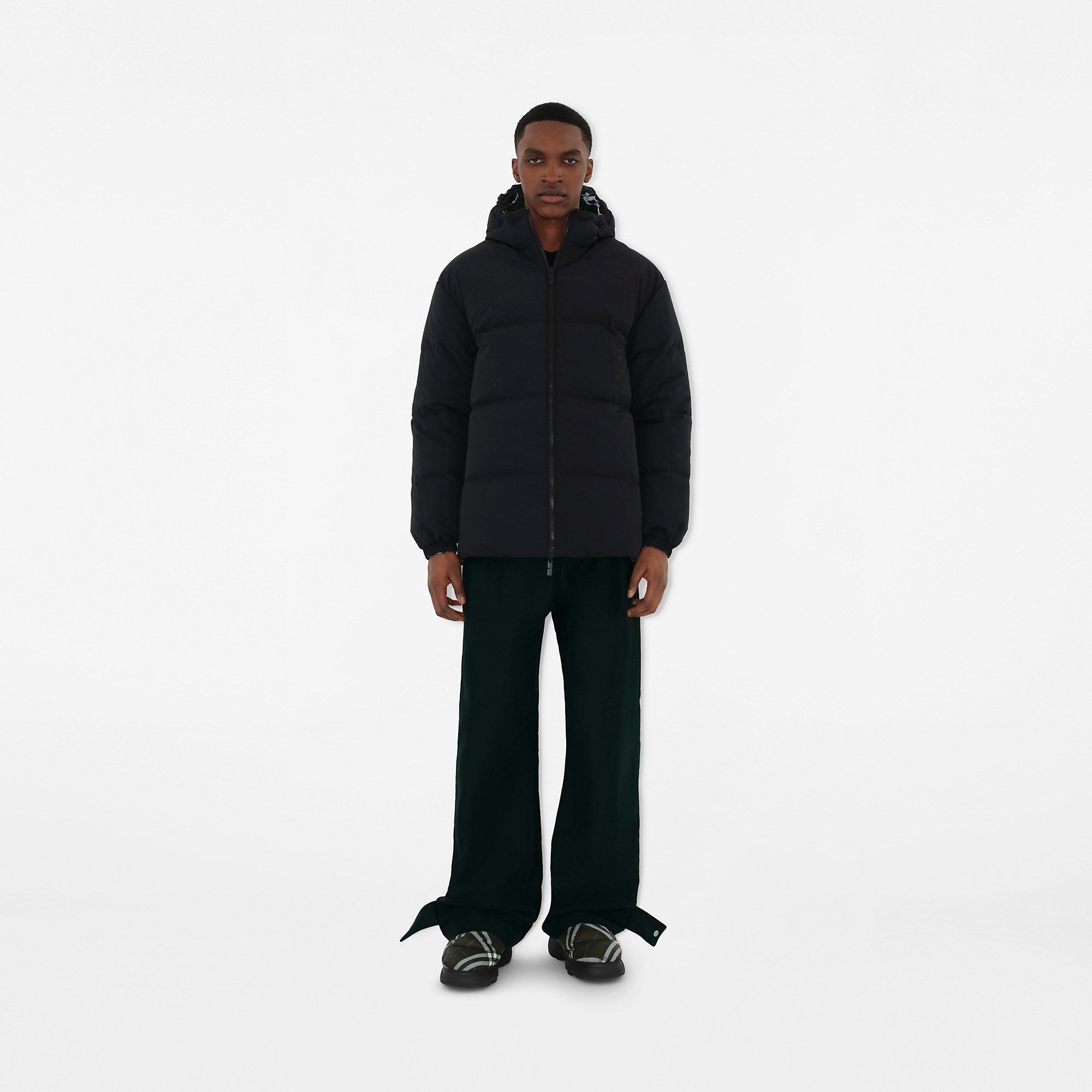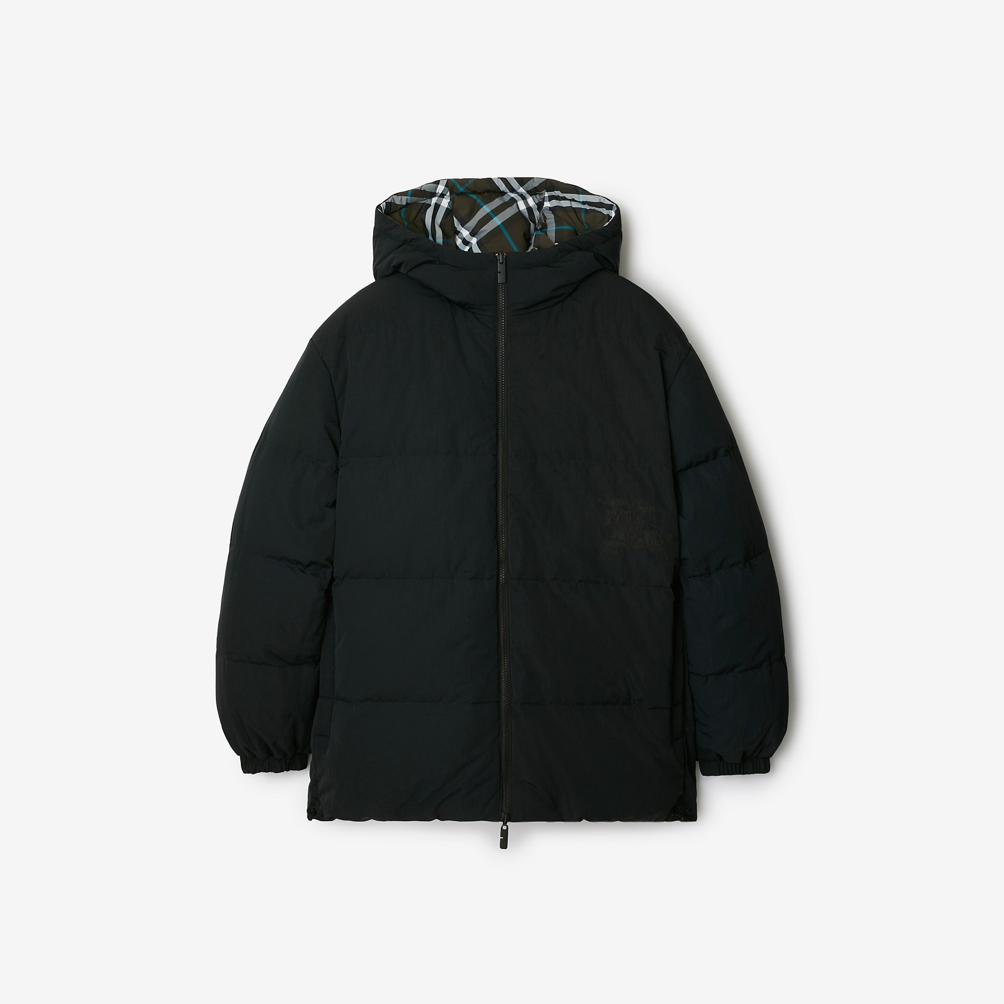Product Details A puffer jacket in nylon, filled with goose down and feathers. The reversible design switches from Burberry Check to a solid colour appliqued with the Equestrian Knight Design. The lightweight style is cut to a relaxed fit. Part of Burberry Classics, wardrobe foundations with a unique Burberry slant. - Two-way zip closure - Drawcord hood and hem - Side zip pockets; reverse press-stud welt pockets - Elasticated cuffs - Appliqued Equestrian Knight Design at front - This item will be packaged in a recycled cotton tote unless the gift packaging option is selected at checkout. - Relaxed fit: a looser cut than our regular fit. Consider taking a size down. - Machine wash - Item 80945941 Size & Fit - Length: 77cm/30.3in (size UK L) - Model’s height: 188cm/6ft 2in. Model wears size UK L Fabric & Care - Outer: 100% polyamide - Reverse: 100% polyamide - Filling: 90% goose down, 10% goose feathers - Wadding: 100% polyester - Imported