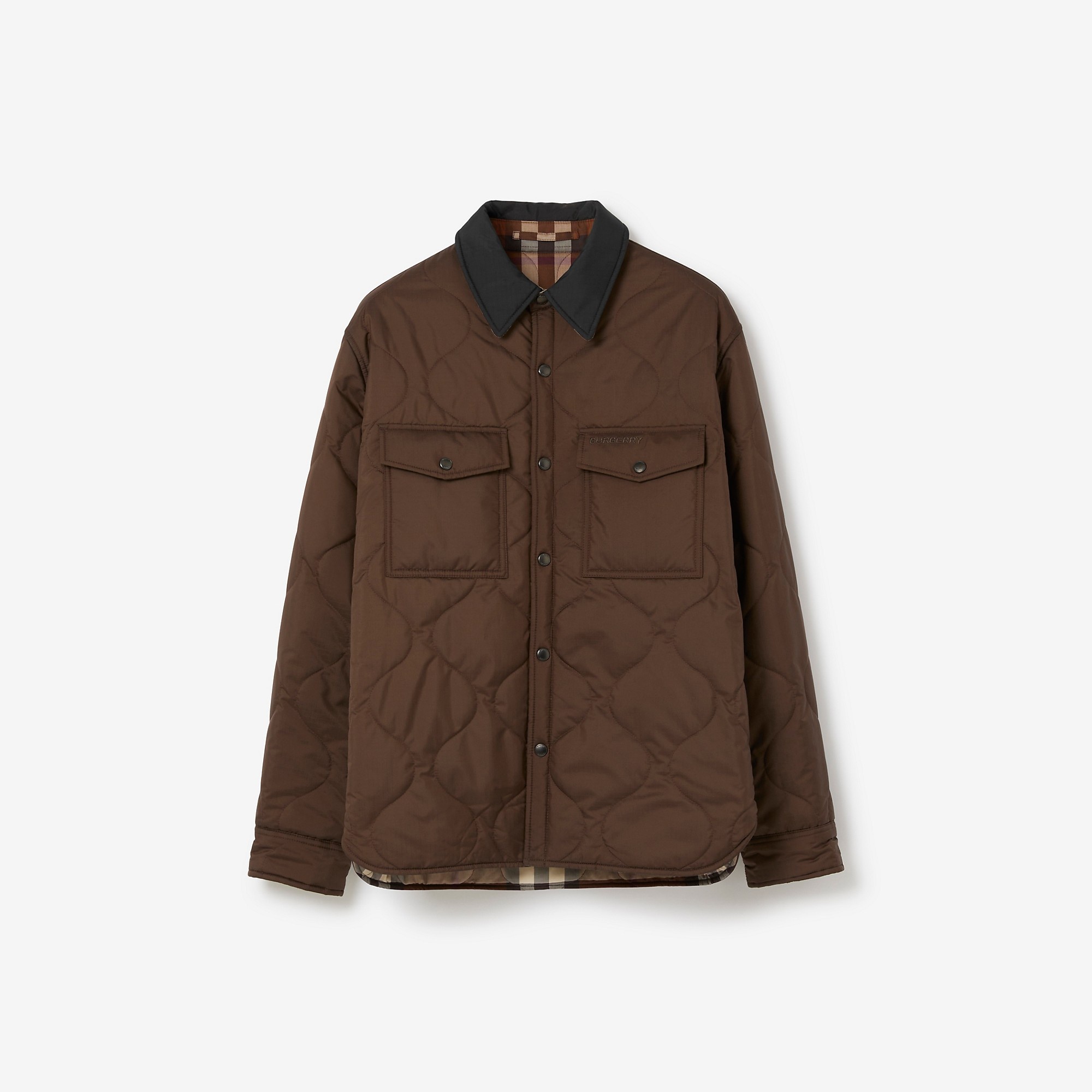 PRODUCT DETAILS A quilted overshirt reversing from a solid colour to the Burberry Check. The cosy style is cut to a relaxed fit. - Overshirt length: 75cm/29.5in (size UK M) - Model’s height: 188cm/6ft 2in. Model wears size UK M Relaxed fit Outer: 100% polyester Reverse: 100% cotton Trim: 100% polyester Filling: 100% polyester Specialist dry clean Imported Item 80636961