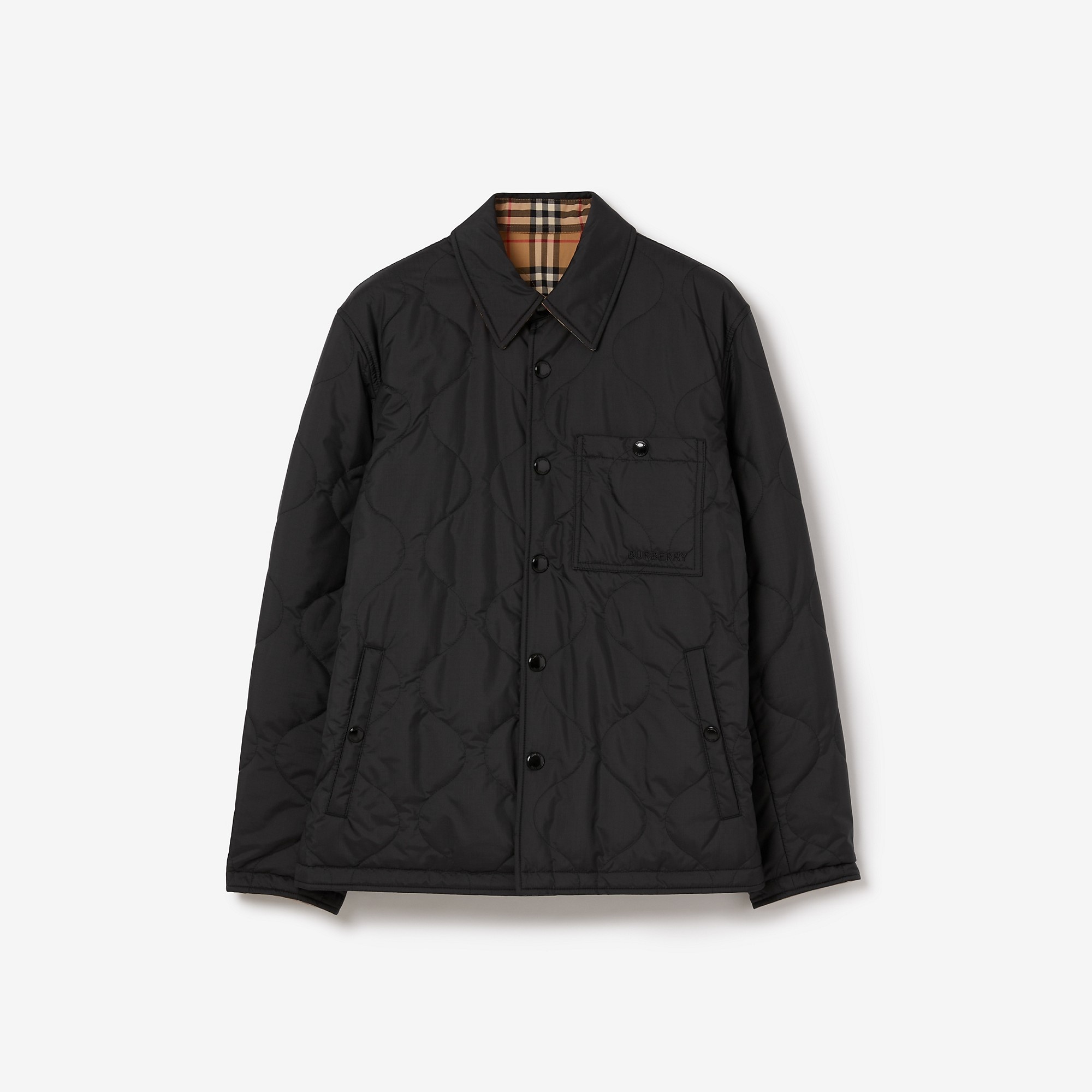 Product Details A quilted overshirt with 37.5® thermoregulation technology for insulation and breathability. The reversible design switches from a solid colour to the Burberry Check and is cut to a relaxed fit. - Press-stud closure - Point collar - Chest press-stud patch pocket, side press-stud welt pockets - Press-stud cuffs - Embroidered Burberry lettering at chest - Burberry Check lining - Relaxed fit: a looser cut than our regular fit. Consider taking a size down. - Item 81001371 Size & Fit - Length: 74cm/29.1in (size UK M) - Model’s height: 185cm/6ft. Model wears size UK M Fabric & Care - Outer: 100% polyester - Reverse: 70% cotton, 30% polyester - Filling: 100% polyester - Specialist dry clean - Imported
