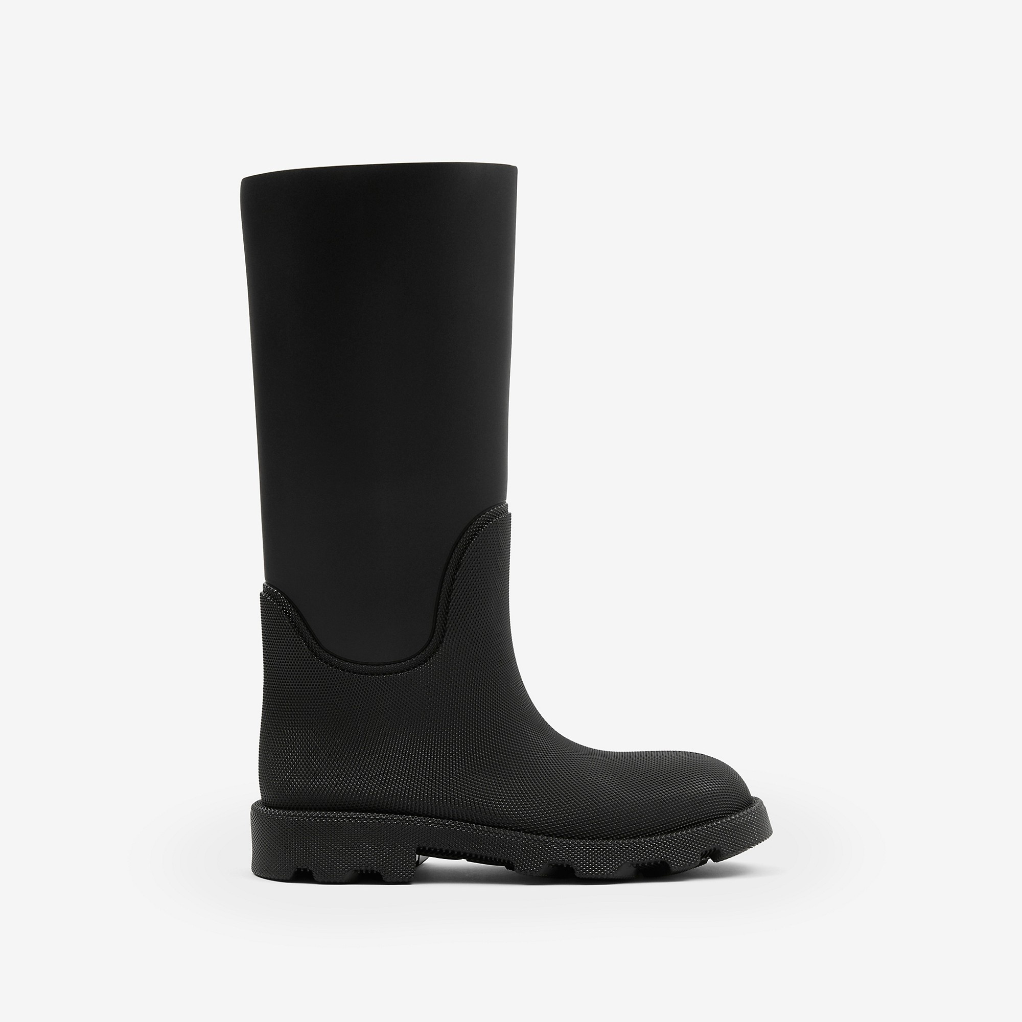 Product Details Italian-made knee boots in rubber with a check lining. Inspired by wellies, the design is set on a chunky sole featuring archival Burberry lettering. - Rounded toe - Check lining - Burberry lettering at sole - Item 80745961 Fabric & Care - Upper: 100% rubber - Lining: 78% polyamide, 22% elastane - Sole: 100% rubber - Made in Italy