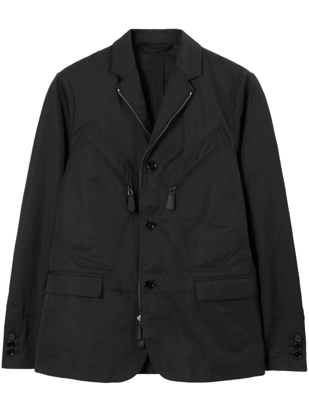 satin-finish tailored jacket Highlights - Black - Cotton - Satin finish - Embroidered logo at the chest - Notched lapels - Buttoned-cuff sleeves - Central rear vent - Two zip-fastening chest pockets - Two front flap pockets - Long sleeves - Front button and zip fastening - Blazer style - Straight hem Made in Italy Composition Cotton 51%, Polyamide 49%