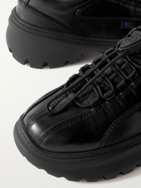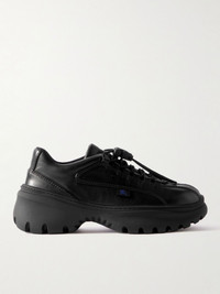 Futuristic in spirit, Burberry's sneakers are made from panels of topstitched leather and have toggle fastenings featuring a signature 'B Shield'. The blue 'Equestrian Knight Design' is split between the substantial rubber soles. Size & Fit - Fits true to size. Take your normal size - Only available in full sizes, go down to the nearest whole size if you take a half size - European sizing Details & Care - Black leather - Toggle fastening - Style number: 8096753