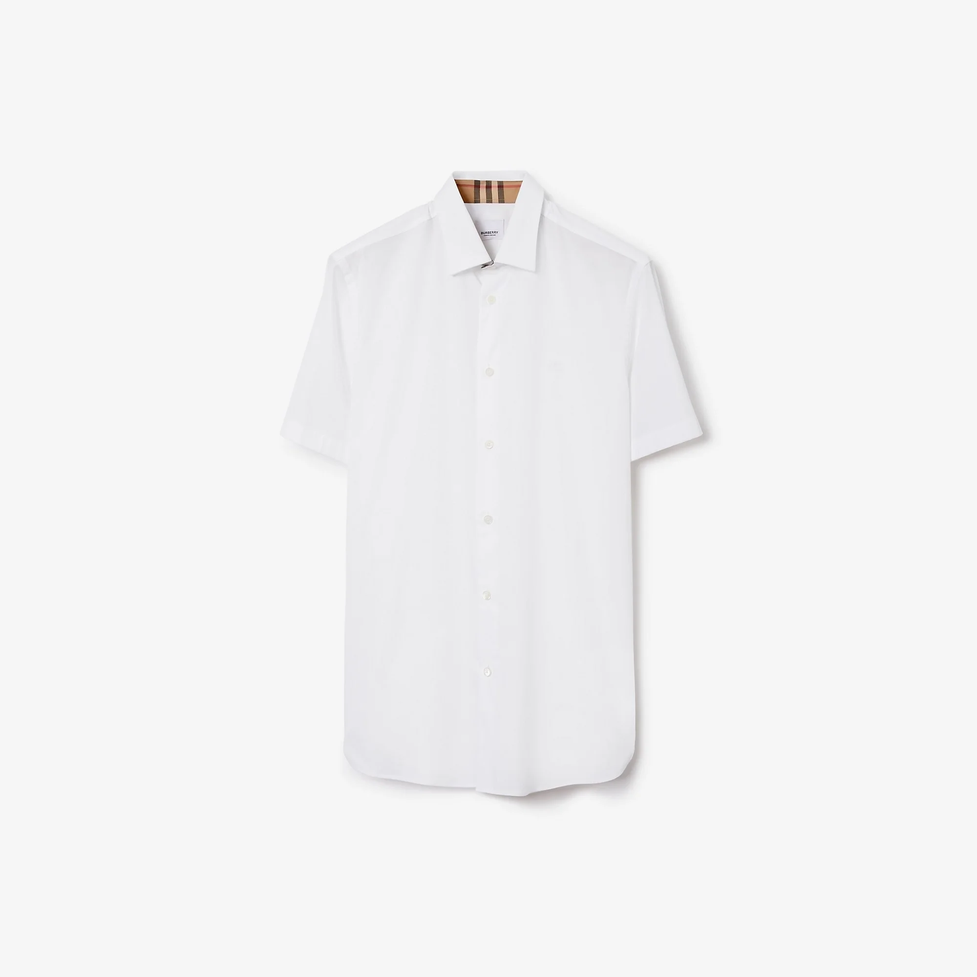 Product Details A short-sleeved shirt in stretch cotton, embroidered with the Equestrian Knight Design. Tailored to a slim fit, the style is lined with Burberry Check at the collar and cuffs. - Button closure - Spread collar - Curved hem - Embroidered Equestrian Knight Design at chest - Slim fit: this style is cut to a fitted silhouette. Fits true to size, take your normal size. - Machine wash - *Containing organic cotton - Item 80795941 Size & Fit - Length: 77cm/30.3in (size UK M) Fabric & Care - 96% cotton, 4% elastane* - Buttons: mother-of-pearl - Imported