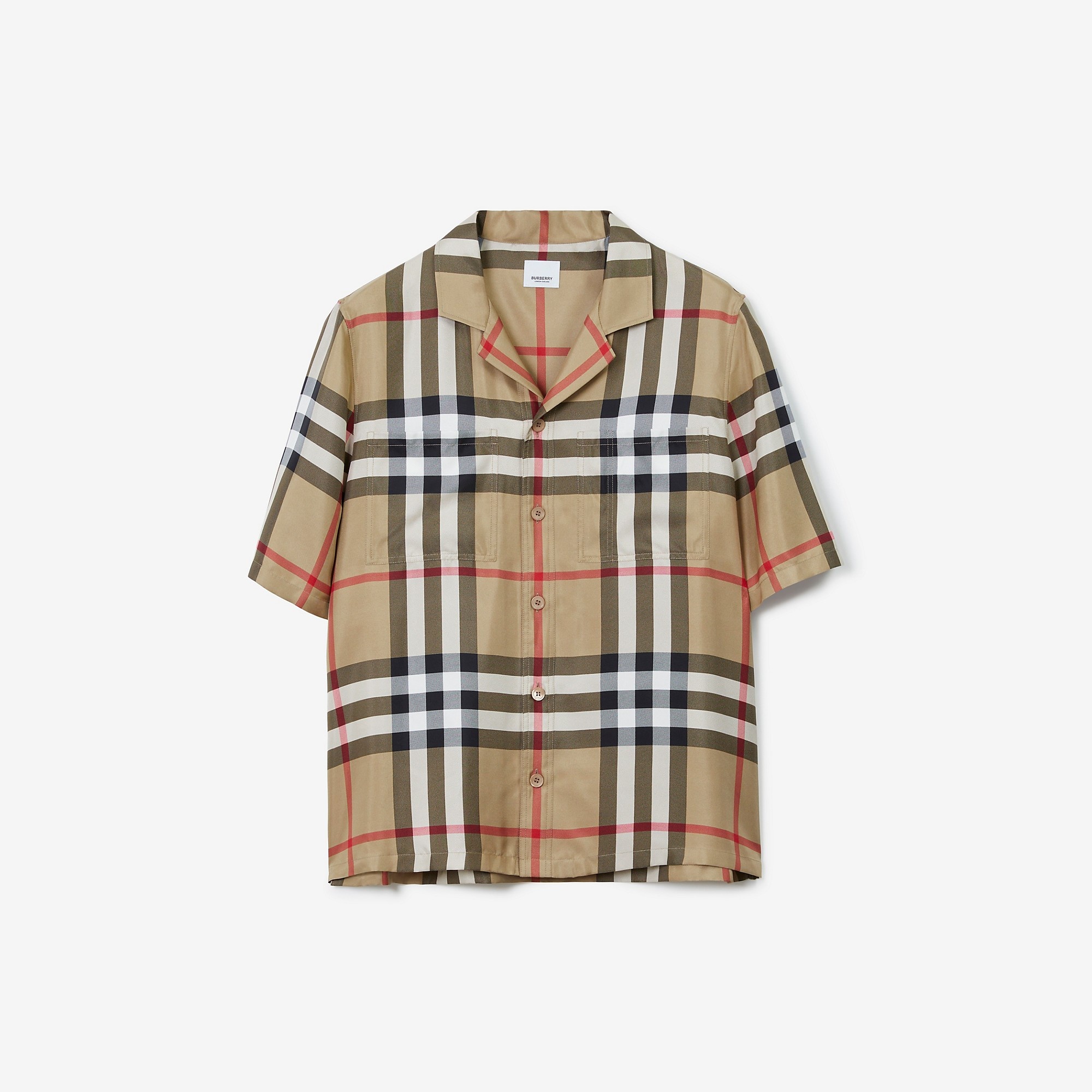 PRODUCT DETAILS A short-sleeved shirt made in Italy from Burberry Check silk twill, cut to a relaxed fit with a revere collar. - Shirt length: 75.5cm/29.7in. This is based on a size UK M. Relaxed fit. This style is cut to a loose silhouette. 100% silk Buttons: mother-of-pearl Short sleeves Revere collar Chest patch pockets Specialist dry clean Made in Italy Item 80502791