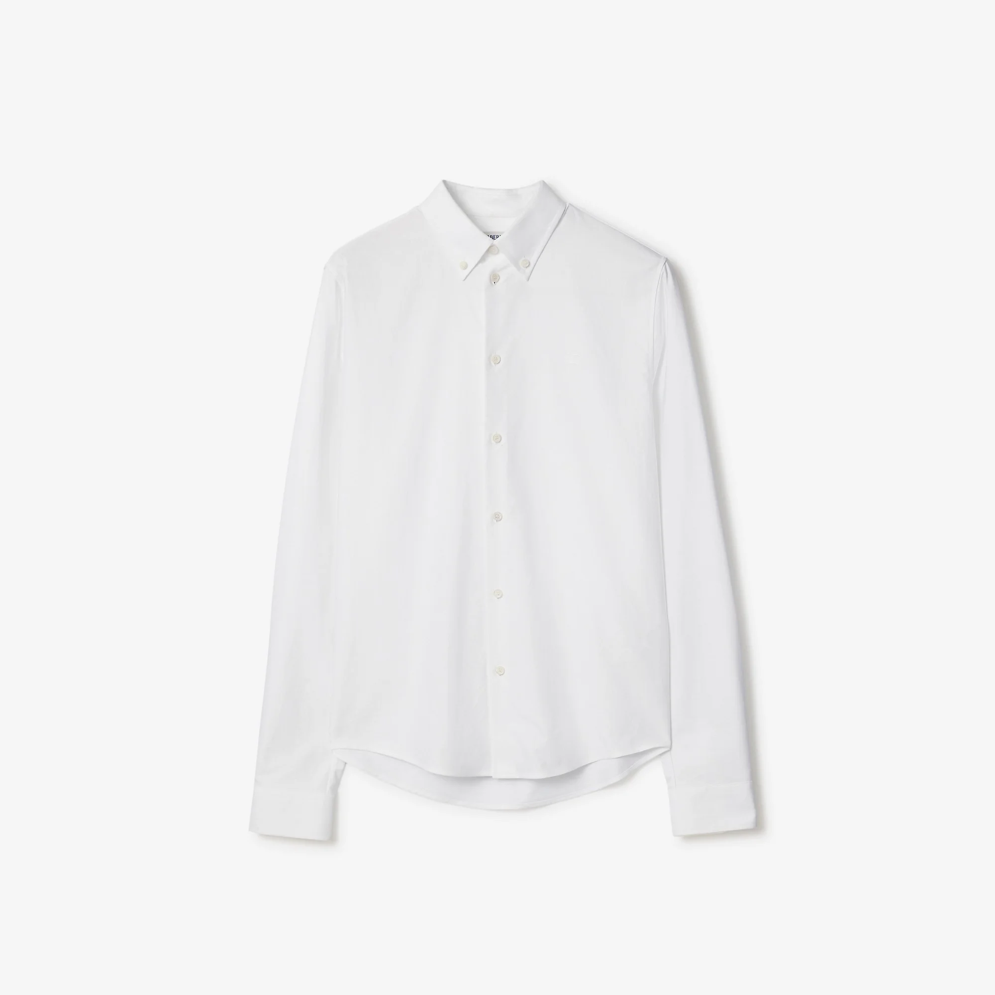 Product Details Slim fit: this style is cut to a fitted silhouette. Fits true to size, take your normal size. A classic cotton Oxford shirt tailored to a slim fit. The style is embroidered with a tonal Equestrian Knight Design and lined with signature Burberry Check taping at the placket and cuffs. - Button closure - Button-down collar - Single-button cuffs - Curved hem - Embroidered Equestrian Knight Design at chest - Machine wash - Item 81219961 Size & Fit - Slim fit: this style is cut to a fitted silhouette. Fits true to size, take your normal size. - Length: 75.5cm/29.7in (size UK M) - Model’s height: 188cm/6ft 2in. Model wears size UK M Fabric & Care - 100% cotton - Buttons: mother-of-pearl - Imported