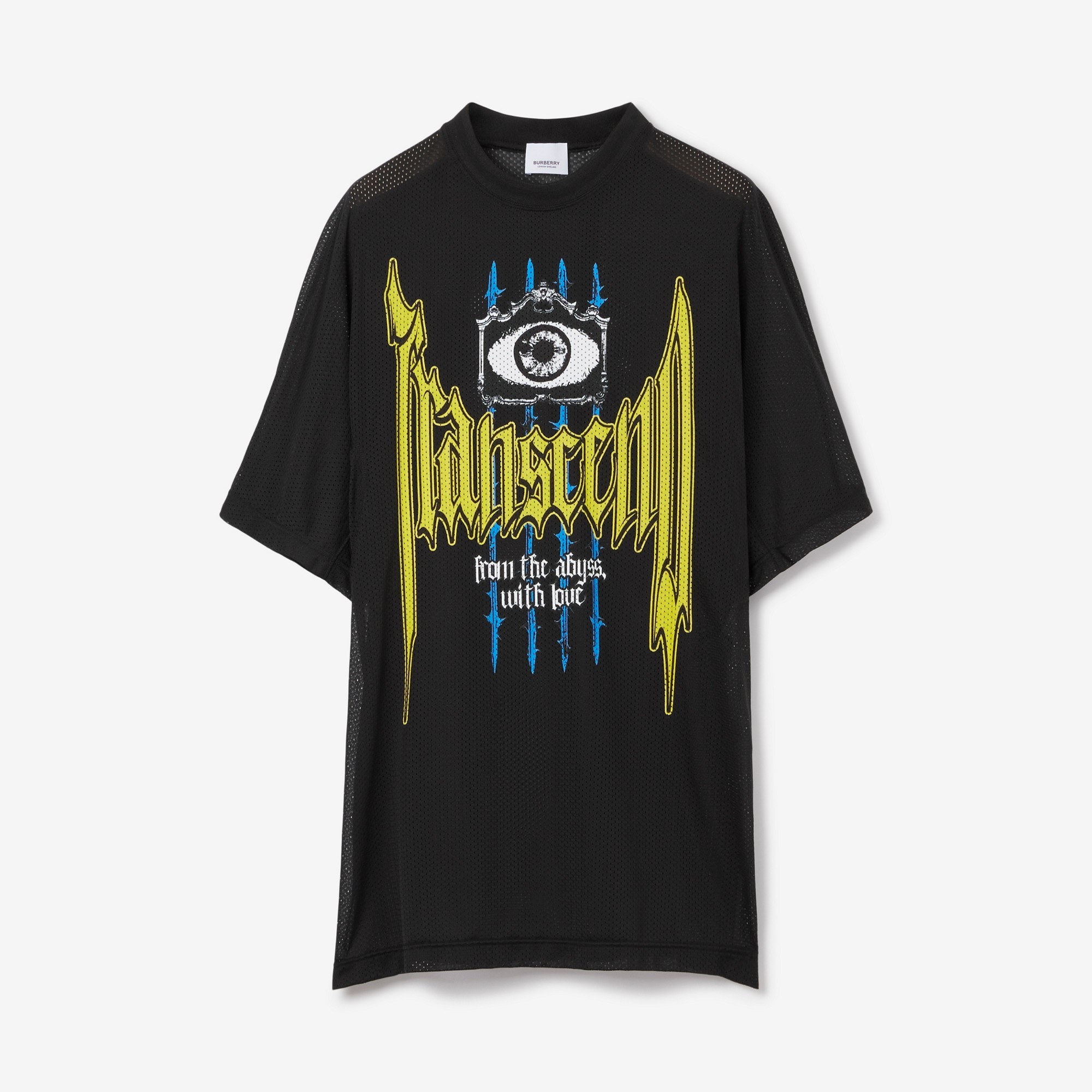 PRODUCT DETAILS A T-shirt reimagined in Italian-woven nylon mesh, highlighted with a graphic slogan print. The design is part of the Burberry Spring/Summer 2023 runway collection. - T-shirt length: 76cm/29.9in. This is based on a size UK M. Oversized fit. This style is cut to exaggerated proportions. 100% polyamide Trim: 94% polyester, 3% polyamide, 3% elastane Machine wash Made in Italy Item 80701471