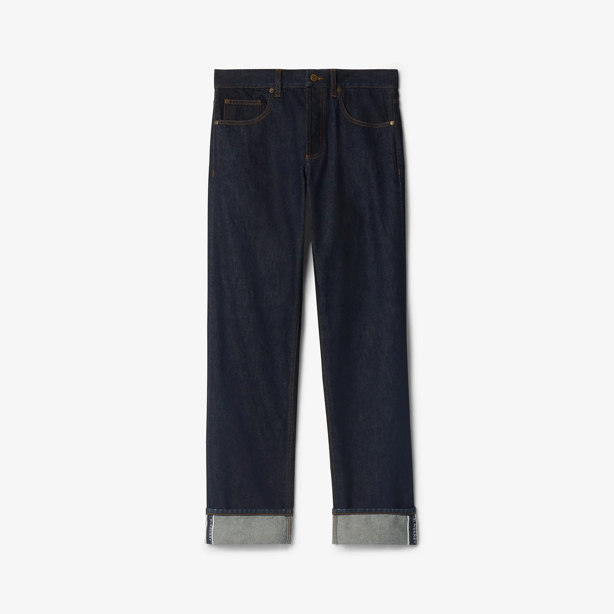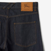 Product Details Regular fit. Fits true to size, take your normal size. Jeans made from selvedge denim in a dark indigo wash, cut to a regular fit with a straight leg. The five-pocket style features turn-ups detailed with Burberry lettering. - Button closure - Suede patch with Equestrian Knight Design at back - Burberry lettering at cuffs - Machine wash - Item 81164181 Size & Fit - Regular fit. Fits true to size, take your normal size. - Inside leg length: 81.5cm/32.1in (size UK 32) - Model’s height: 188cm/6ft 2in. Model wears size UK 32 Fabric & Care - 100% cotton - Trim: 100% calf suede - Pocket lining: 65% polyester, 35% cotton - Imported